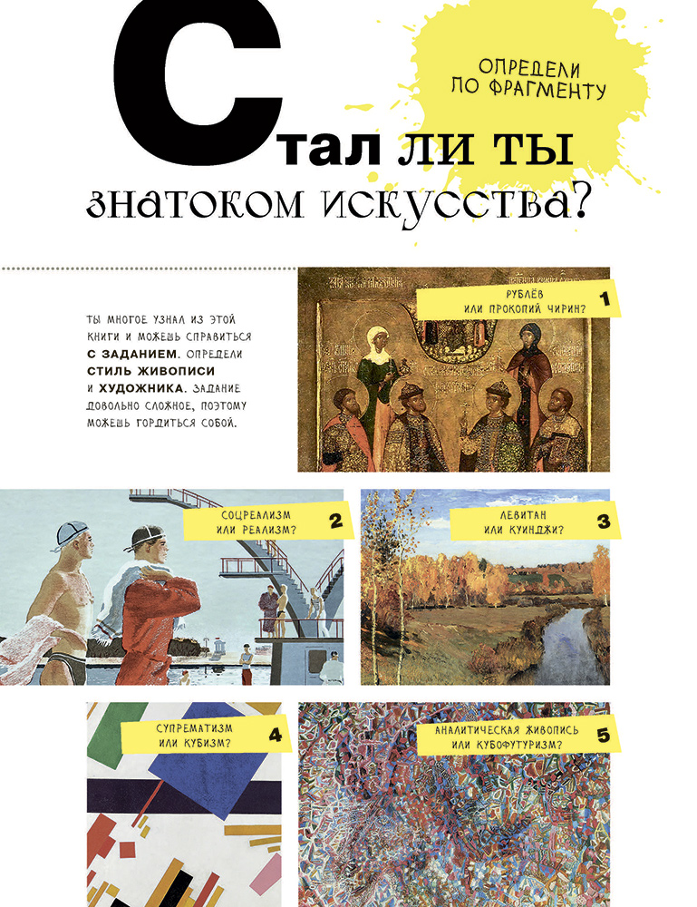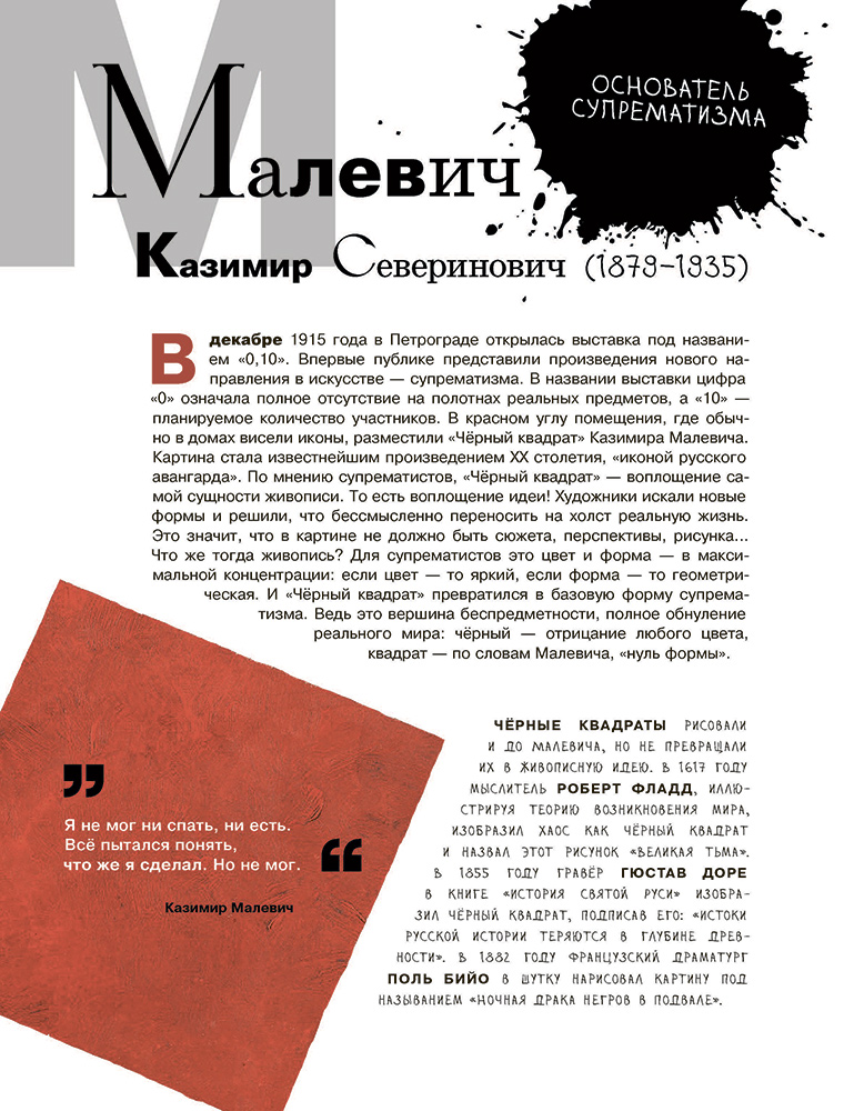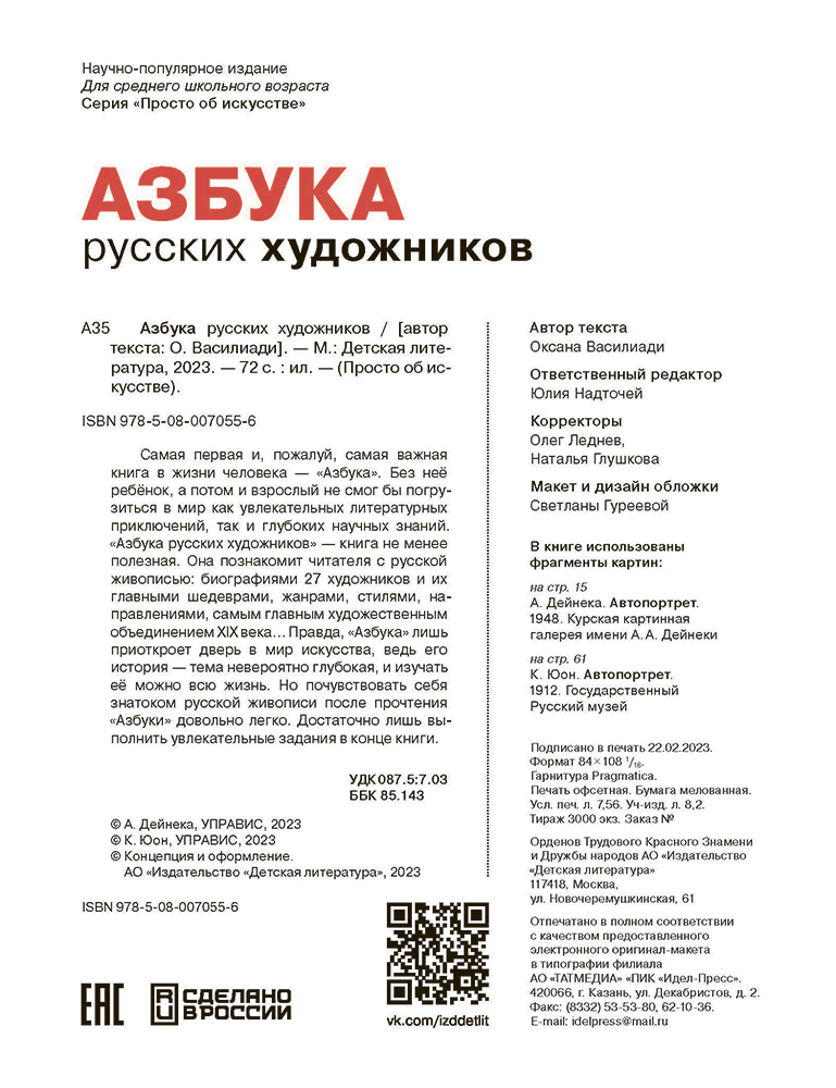 (12+) Самая первая и, пожалуй, самая важная книга в жизни человека — «Азбука». Без неё ребёнок, а потом и взрослый не смог бы погрузиться в мир как увлекательных литературных приключений, так и глубоких научных знаний. «Азбука русских художников» — книга не менее полезная. Она познакомит читателя с русской живописью: биографиями 27 художников и их главными шедеврами, жанрами, стилями, направлениями, самым главным художественным объединением XIX века…