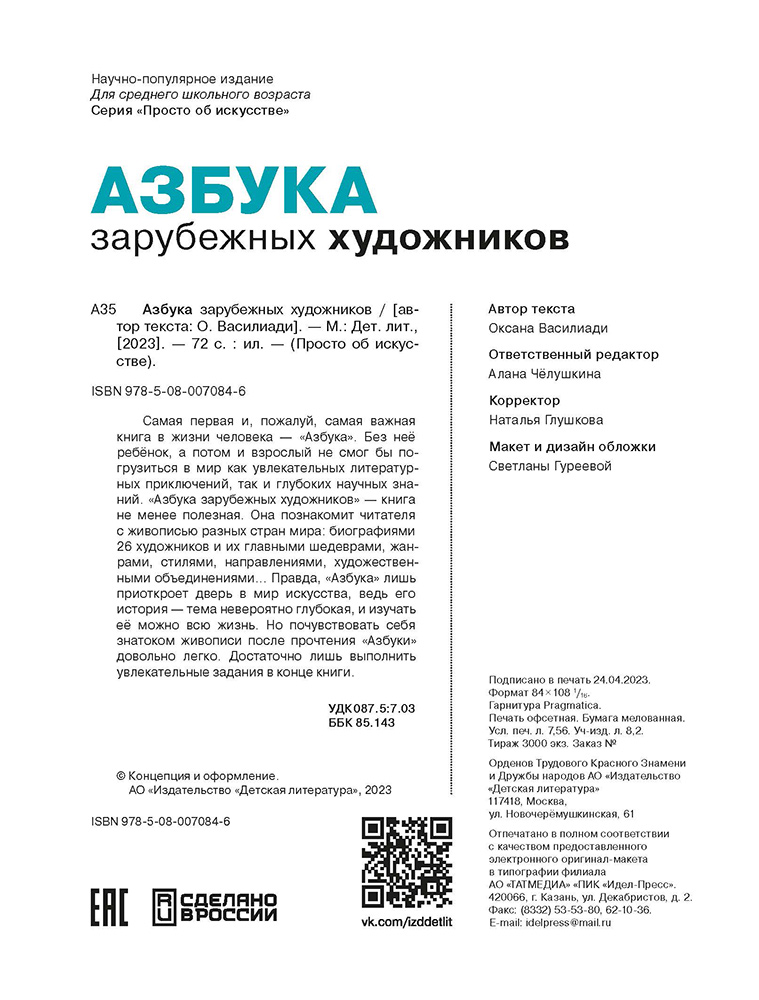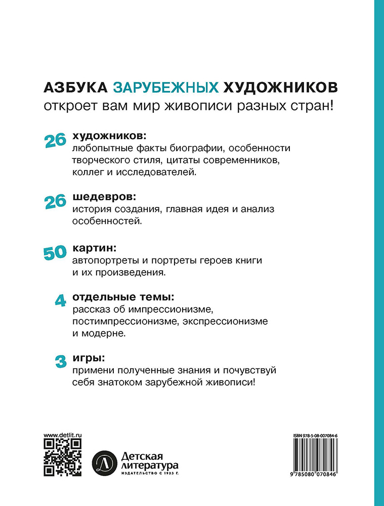 (12+) Самая первая и, пожалуй, самая важная книга в жизни человека — «Азбука». Без неё ребёнок, а потом и взрослый не смог бы погрузиться в мир как увлекательных литературных приключений, так и глубоких научных знаний. «Азбука зарубежных художников» — книга не менее полезная. Она познакомит читателя с живописью разных стран мира: биографиями 26 художников и их главными шедеврами, жанрами, стилями, направлениями, художественными объединениями...