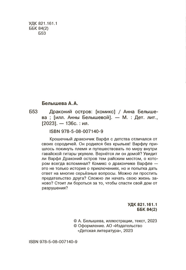 (6+) Крошечный дракончик Варфл с детства отличался от своих сородичей. Он родился без крыльев! Варфлу пришлось покинуть племя и путешествовать по миру внутри гавайской гитары укулеле. Вернётся ли он домой? Увидит ли Варфл Драконий остров тем райским местом, о котором всегда вспоминал? Комикс о дракончике Варфле — это не только история о приключениях, но и попытка дать ответ на многие серьёзные вопросы. Можно ли простить предательство друга? Сложно ли начать свою жизнь заново? Стоит ли бороться за то, чтобы спасти свой дом от разрушения? Для младшего школьного возраста.