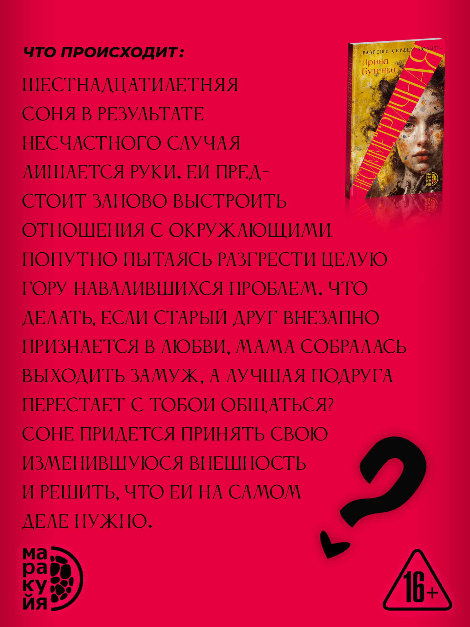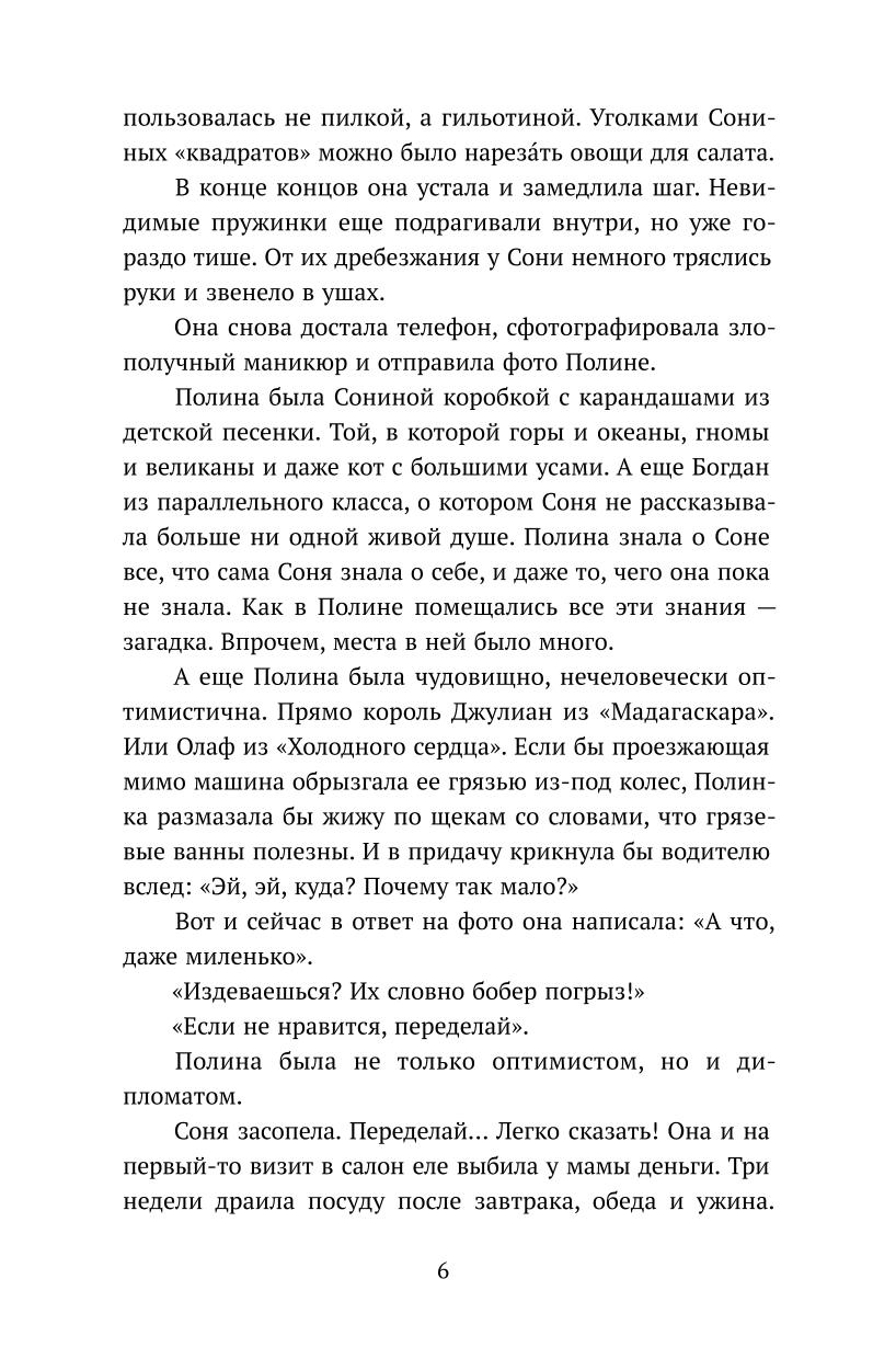 (16+) Шестнадцатилетняя Соня в результате несчастного случая лишается руки. Ей предстоит заново выстроить отношения с окружающими, попутно пытаясь разгрести целую гору навалившихся проблем. Что делать, если старый друг внезапно признается в любви, мама собралась выходить замуж, а лучшая подруга перестает с тобой общаться? Соне придется научиться принимать свою изменившуюся внешность и решить, что ей на самом деле нужно.