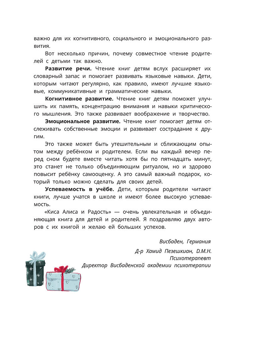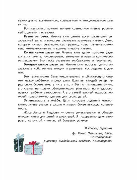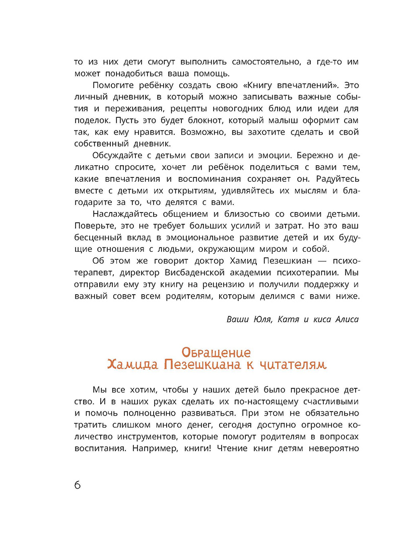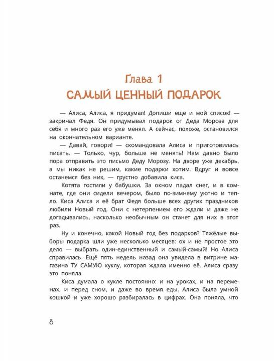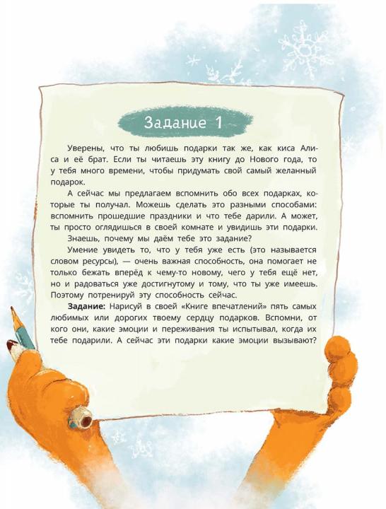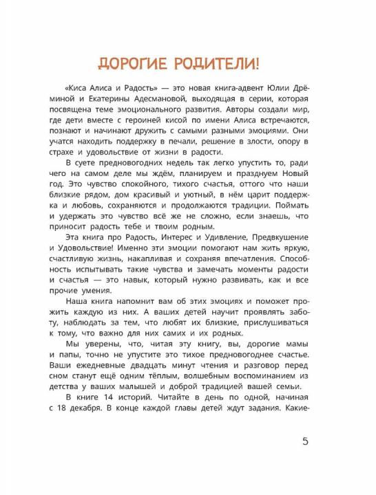 (6+) Радость, интерес, удивление, предвкушение и удовольствие – именно эти эмоции помогают каждому человеку жить яркую, счастливую жизнь, накапливая и сохраняя впечатления. Способность испытывать такие чувства и замечать моменты радости и счастья — это навык, который нужно развивать, как и все прочие умения. Киса Алиса учится проживать эти эмоции вместе со своей семьёй. А специальные задания, которые мы подготовили для ваших детей, сделают эту книгу не просто волшебной сказкой, а настоящим инструментом по развитию эмоционального интеллекта. Читайте с удовольствием! Для младшего школьного возраста.