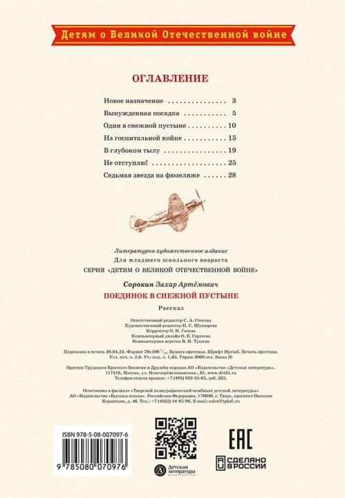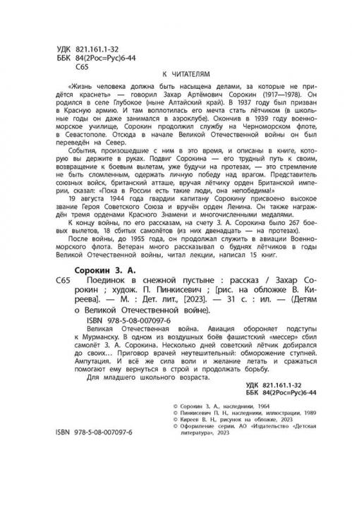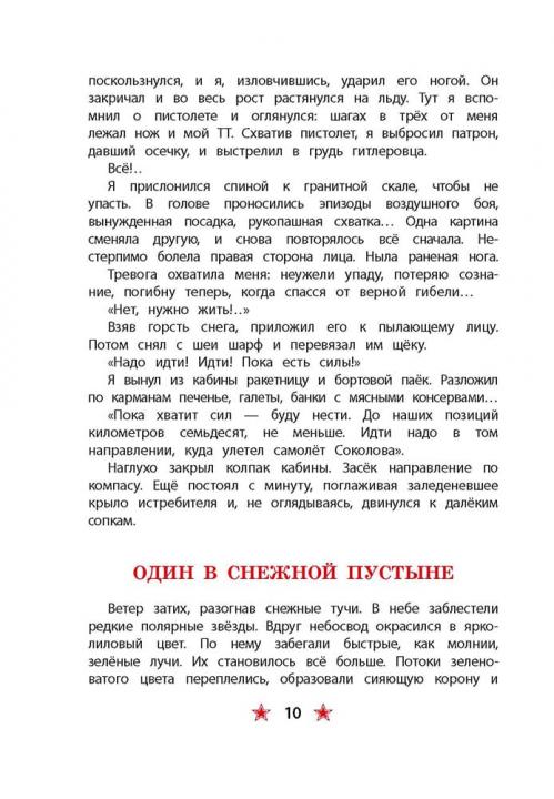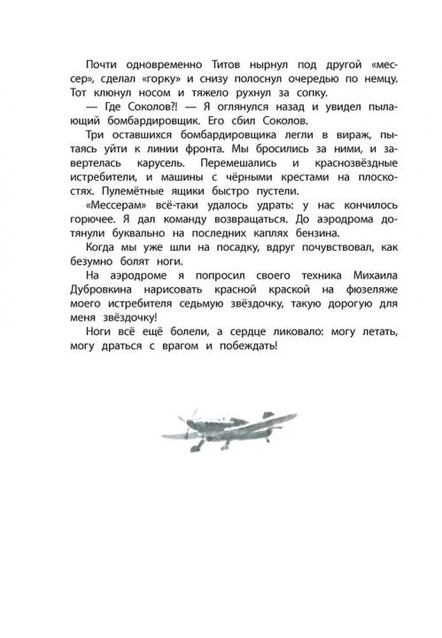 (6+) Великая Отечественная война. Авиация обороняет подступы к Мурманску. В одном из воздушных боёв фашистский «мессер» сбил самолёт З. А. Сорокина. Несколько дней советский лётчик добирался до своих… Приговор врачей неутешительный: обморожение ступней. Ампутация. И всё же сила воли и желание летать и сражаться помогают ему вернуться в строй и продолжать борьбу. Для младшего школьного возраста.