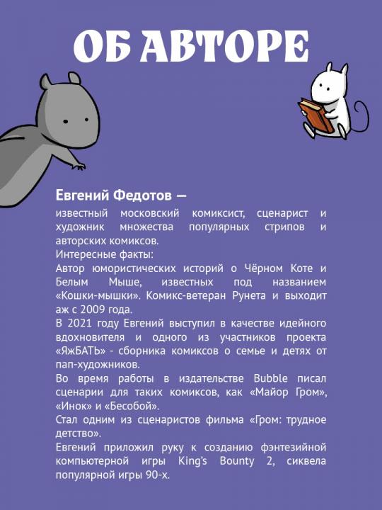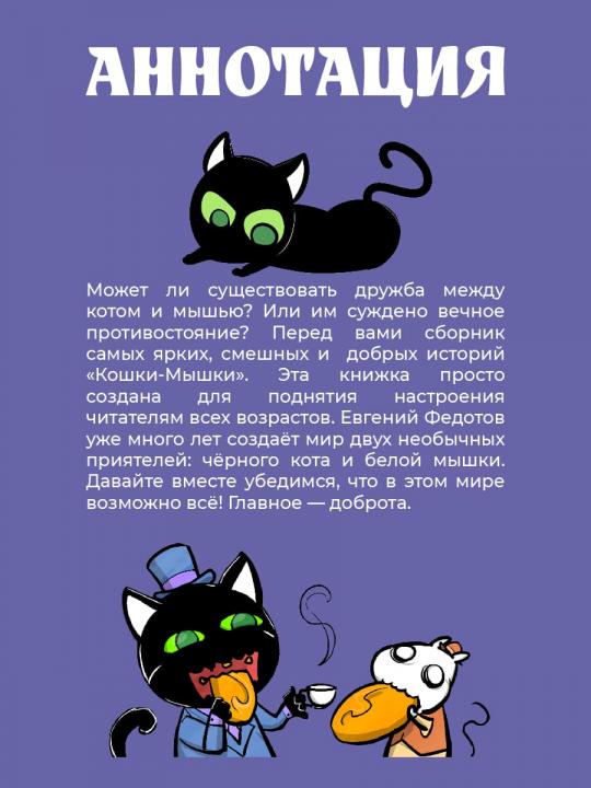 Перед вами сборник самых ярких, смешных и добрых историй «Кошки-Мышки». Эта книжка просто создана для поднятия настроения читателям всех возрастов. Евгений Федотов уже много лет создаёт мир двух необычных приятелей: чёрного кота и белой мышки.