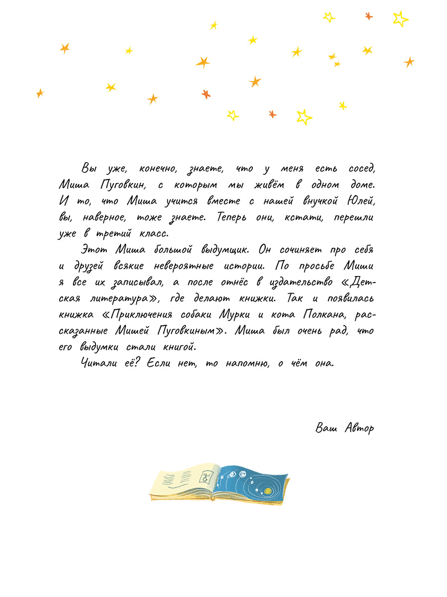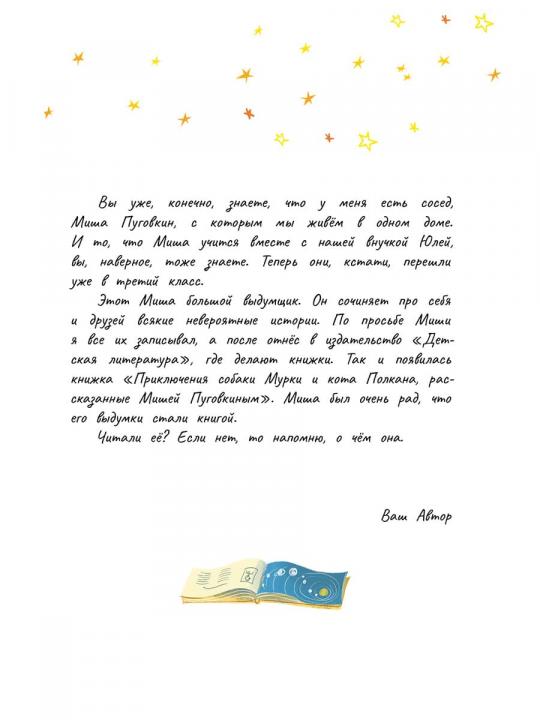 Кто сумеет помирить людей с созвездиями? Конечно он, Миша Пуговкин, и его верные друзья — собака Мурка и кот Полкан! А ещё — вечный космонавт планеты Земля Юрий Гагарин, вместе с которым они отправятся в настоящее межзвёздное путешествие!