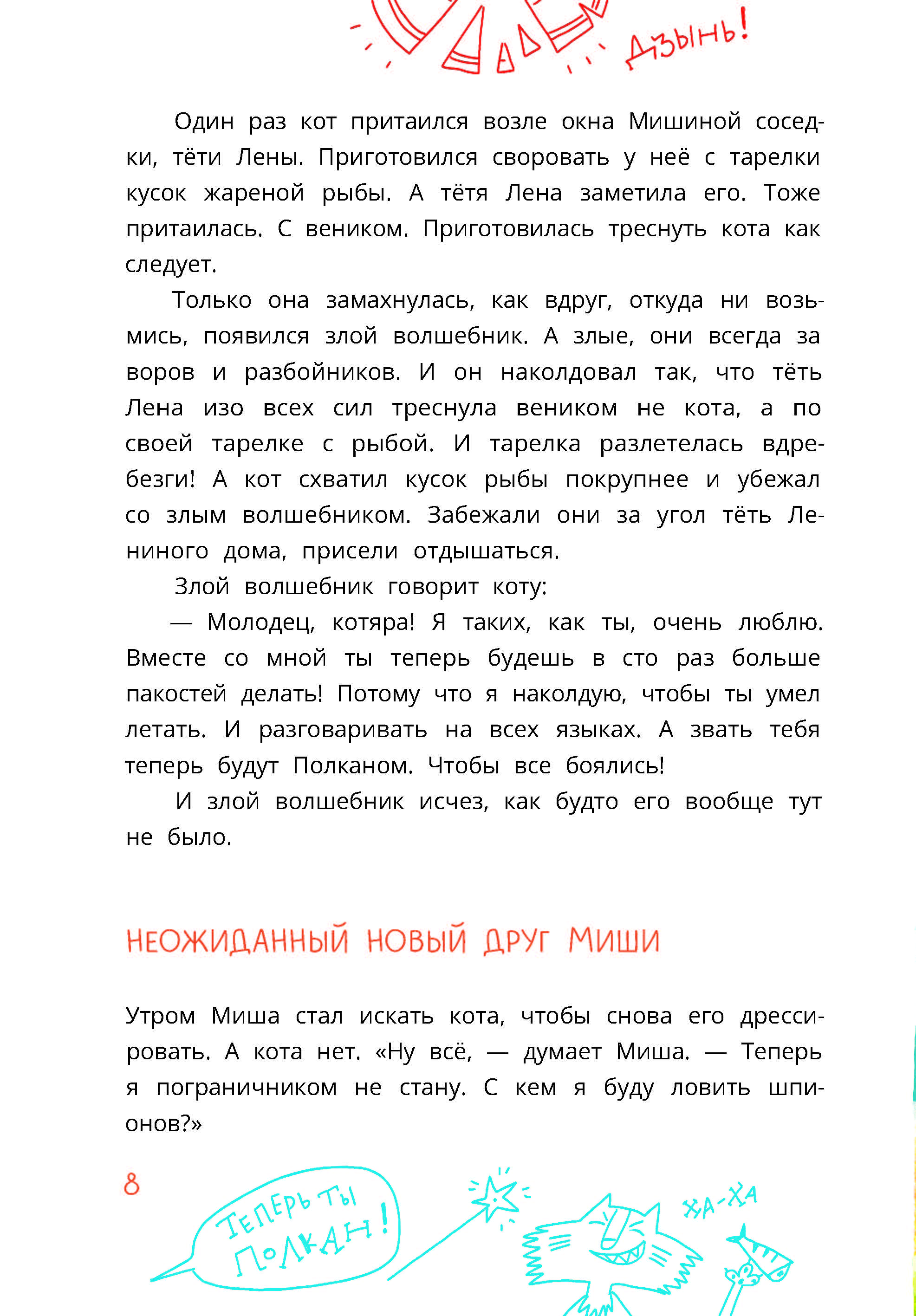 (6+) Внимание-внимание! Кто это там безобразничает? А кто совершает отважные подвиги? Да это же второклассник Миша Пуговкин, хитрый кот Полкан и добрейшей души собака Мурка! Как-как их зовут? Мы точно никого не перепутали? Миша проводит время с пользой — летает на самолёте в далёкую Бразилию, ловит шпионов на границе, путешествует на подводной лодке и спасает цирковых зверей. И когда он только успевает рассказывать истории о своих весёлых приключениях?