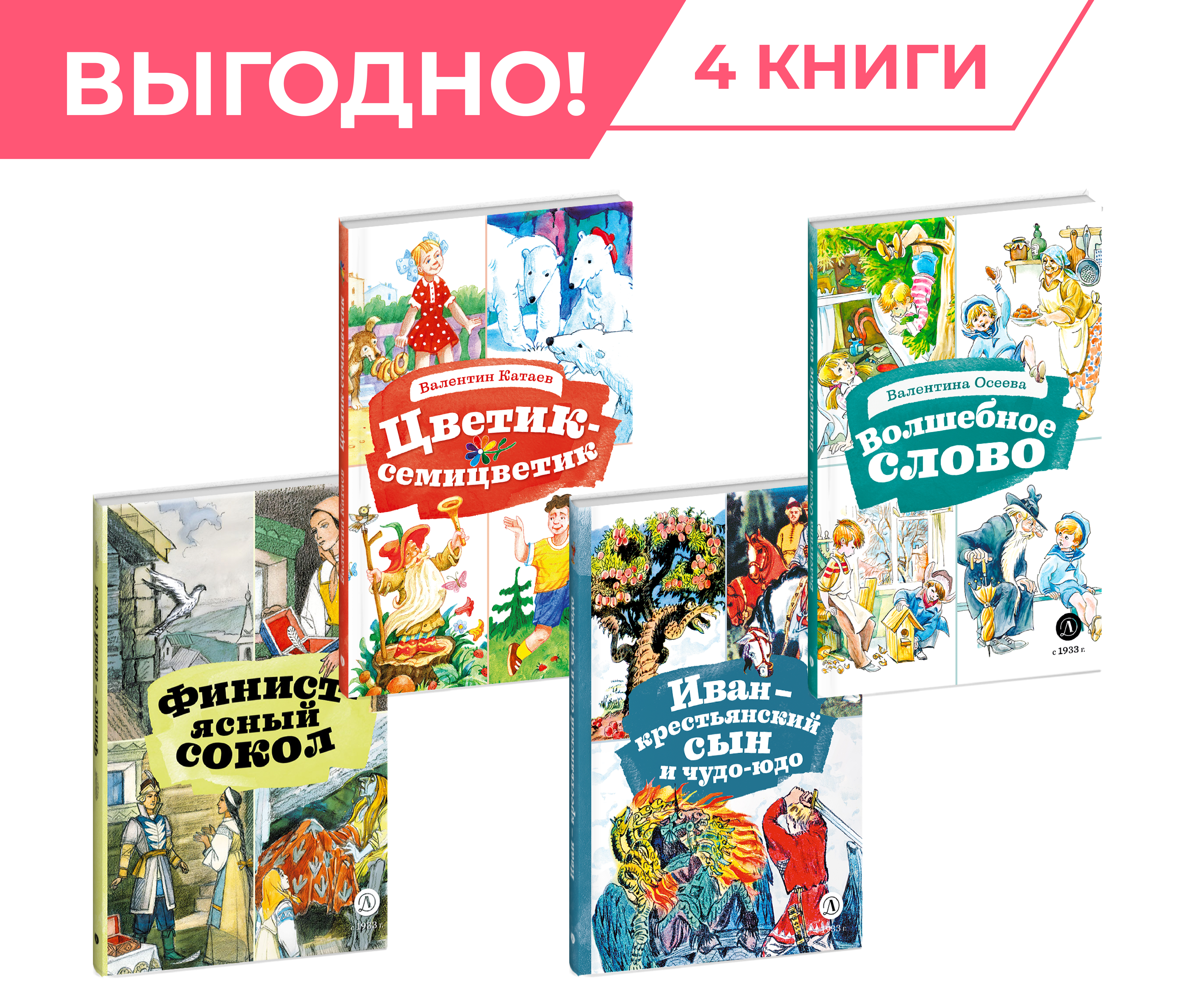 (6+) В комплект "Читаем в начальной школе" входят 4 классических произведения, предназначенных для изучения в начальной школе: "Финист-Ясный Сокол", "Иван-Крестьянский сын", "Волшебное слово" и "Цветик-семицветик".