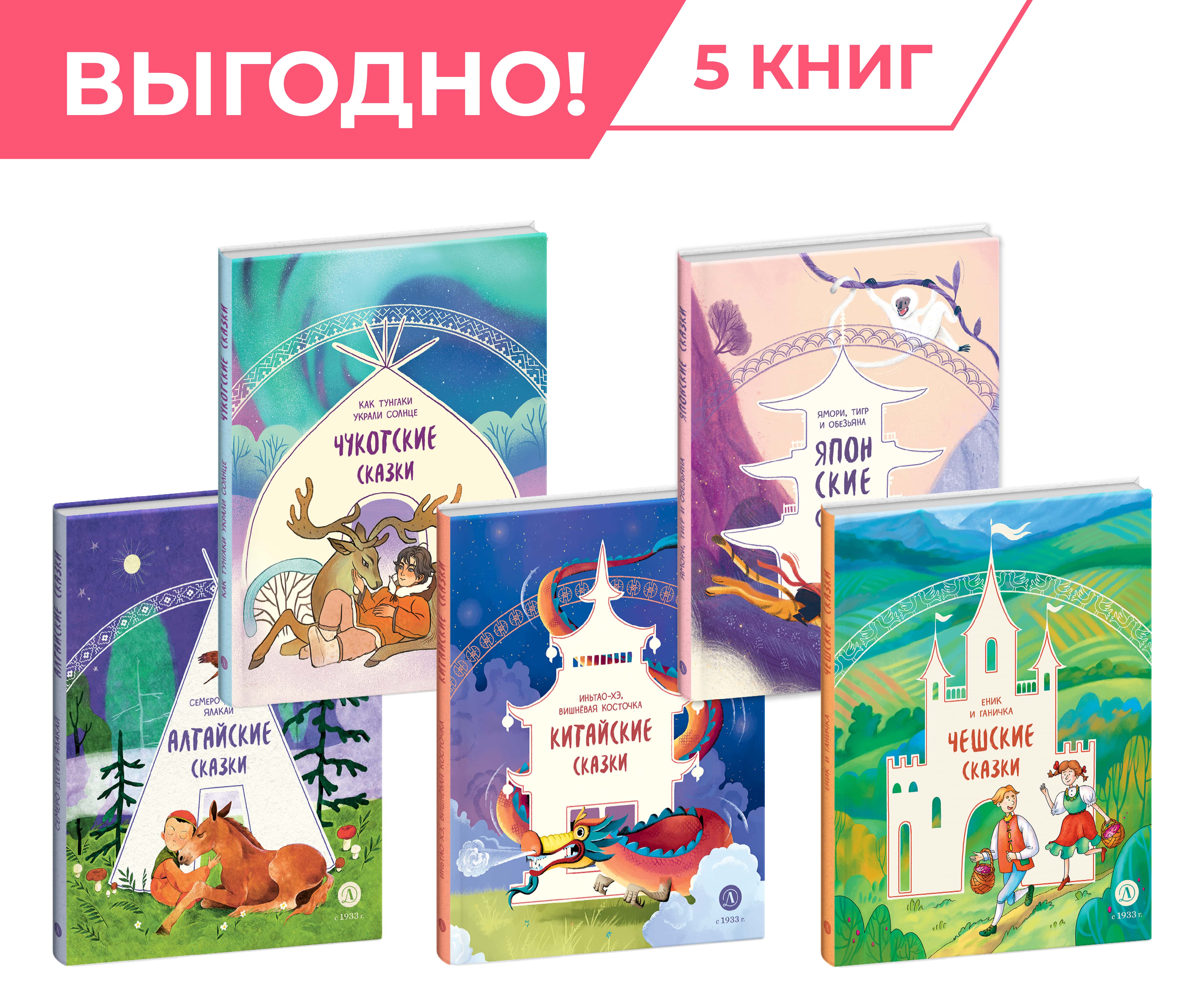 (6+) Сказки народов мира с красивыми иллюстрациями и удобного формата. В комплект входят 5 книг: "Алтайские сказки", "Китайские сказки", "Чешские сказки", "Чукотские сказки" и "Японские сказки".