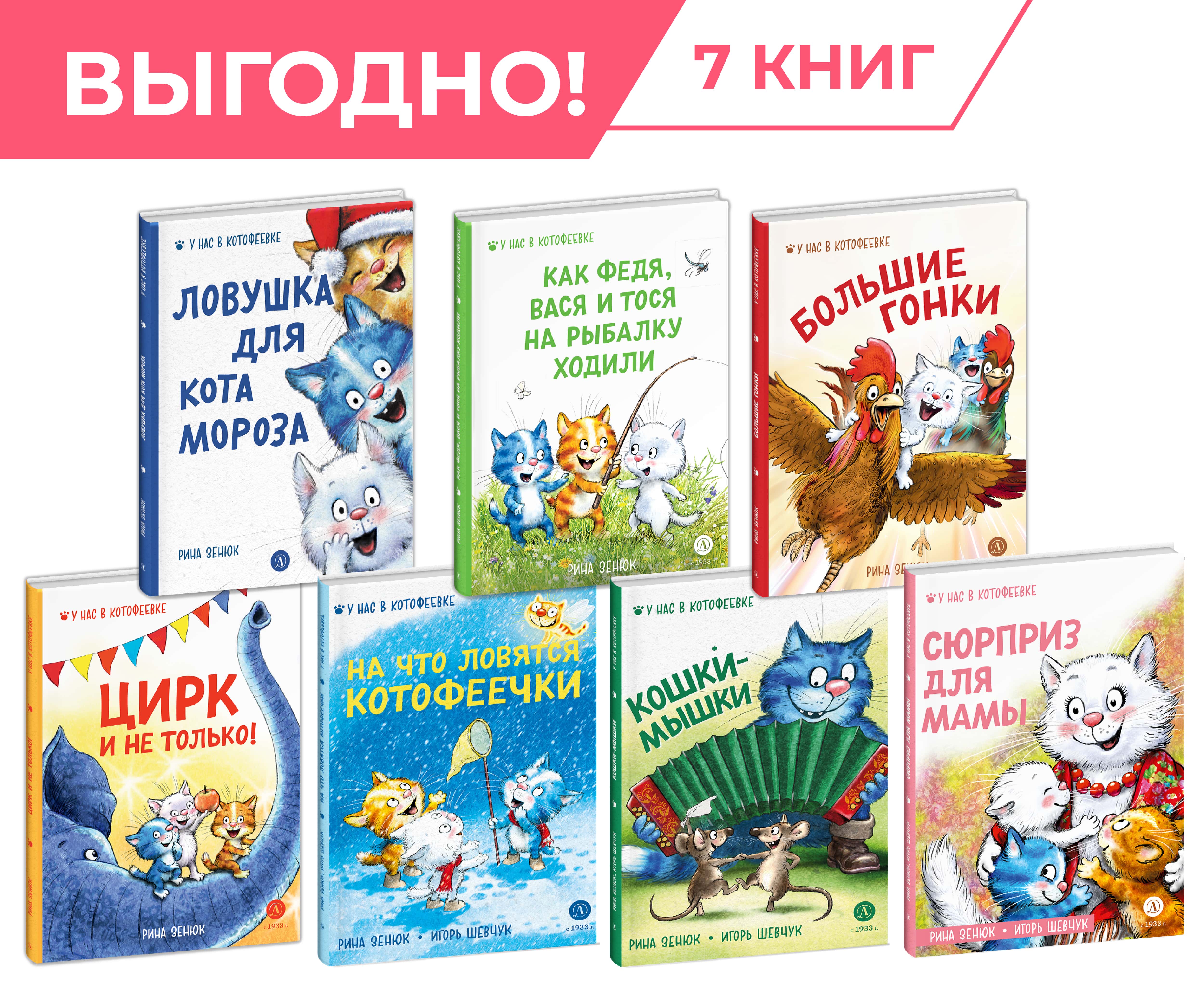 (3+) Серия книг "У нас в Котофеевке" подойдет как самый маленьким читателям, так и тем, кто осваивает самостоятельное чтение. Вместе с тремя котятами: Федей, Васей и Тосей вы попадете в цирк, устроите гонки на петухах и даже увидите которусалку! С нашими героями скучно точно не будет! Крупный шрифт и красивые илююстрации Рины Зенюк не оставят вас равнодушными. В комплект входят 7 книг: "Как Федя, Вася и Тося на рыбалку ходили", "Ловушка для Кота Мороза", "Цирк и не только", "Большие гонки", "На что ловятся котофеечки", "Кошки-мышки" и "Сюрприз для мамы".