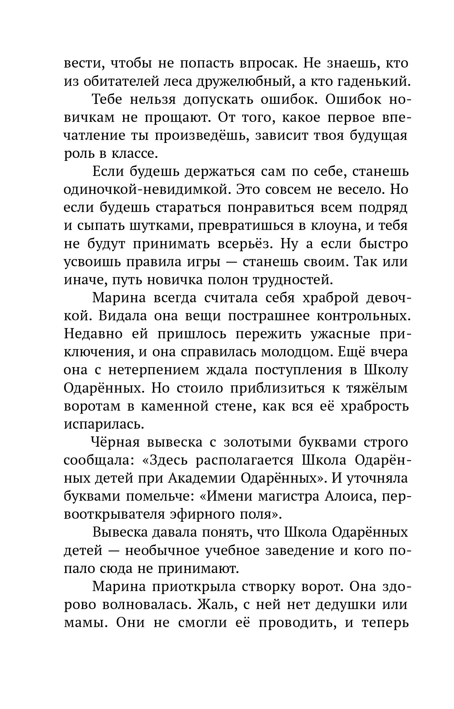- Новое место действия — Школа Одарённых, новые знакомые — преподаватели и ученики Школы, новая подруга Марины и Яна — простоватая болтушка Элфи, которая, как оказалось, умеет разгадывать шифры.