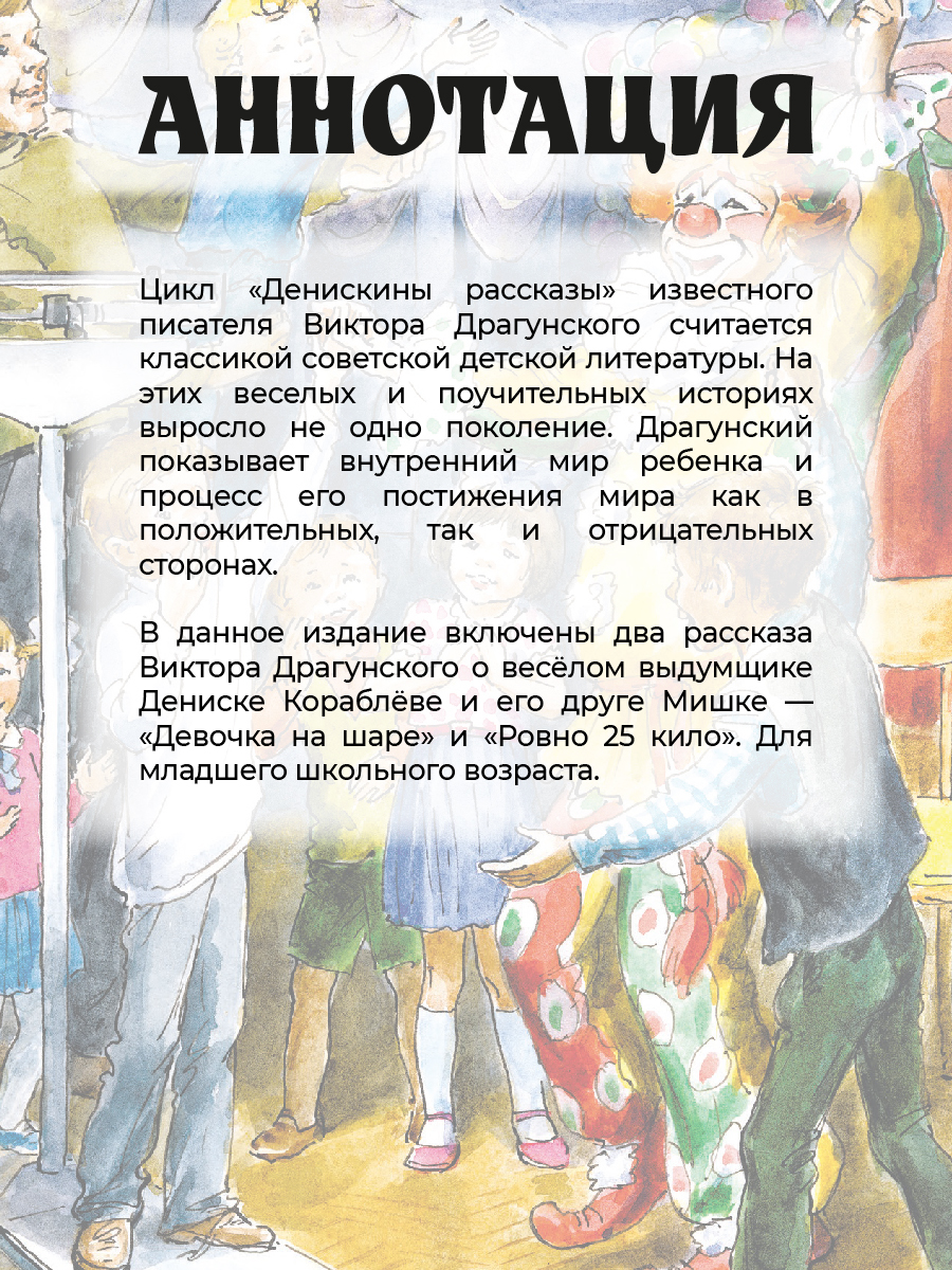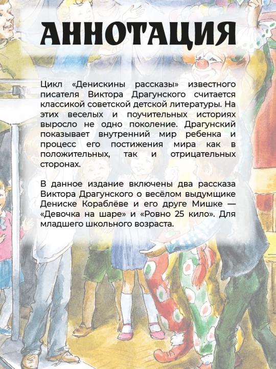 В данное издание включены два рассказа Виктора Драгунского о весёлом выдумщике Дениске Кораблёве и его друге Мишке — «Девочка на шаре» и «Ровно 25 кило». Для младшего школьного возраста.