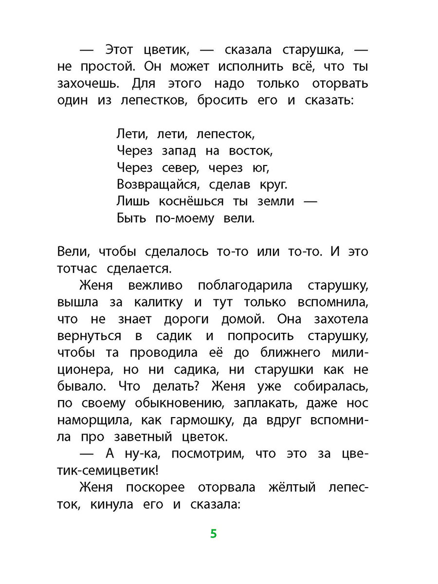 5. «Цветик-семицветик» - поучительная сказка, которая поможет юному читателю усвоить важный урок, что свои цели и желания надо формулировать осознанно и с большой ответственностью.