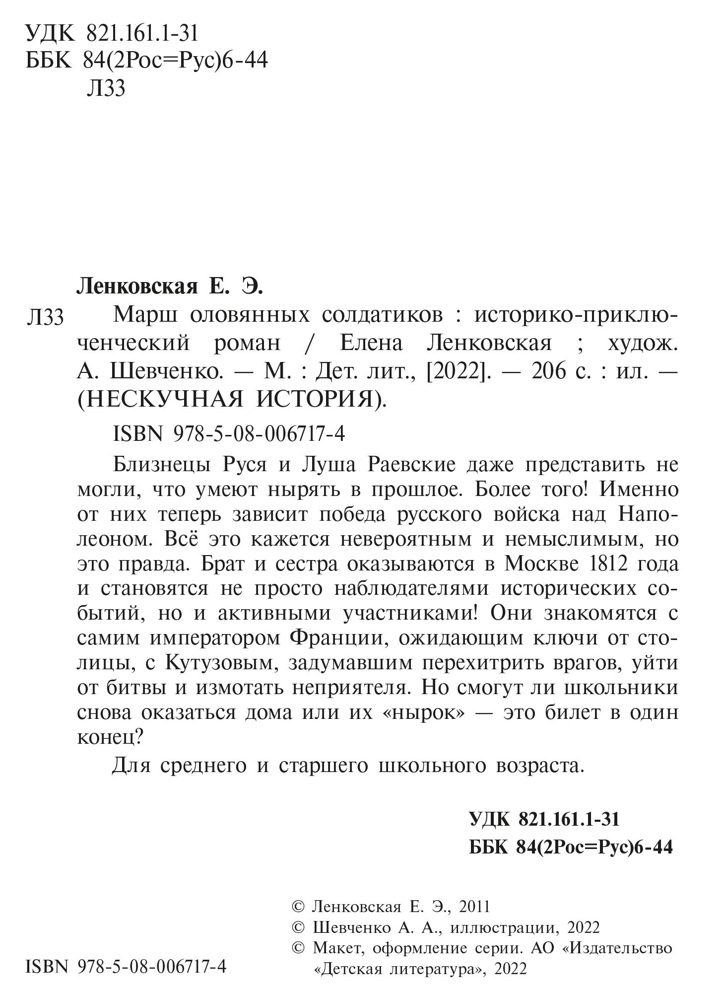 (12+) Близнецы Руся и Луша Раевские даже представить не могли, что умеют нырять в прошлое. Более того! Именно от них теперь зависит победа русского войска над Наполеоном. Всё это кажется невероятным и немыслимым, но это правда. Брат и сестра оказываются в Москве 1812 года и становятся не просто наблюдателями исторических событий, но и активными участниками! Они знакомятся с самим императором Франции, ожидающим ключи от столицы, с Кутузовым, задумавшим перехитрить врагов, уйти от битвы и измотать неприятеля. Но смогут ли школьники снова оказаться дома или их «нырок» — это билет в один конец? Для среднего и старшего школьного возраста.