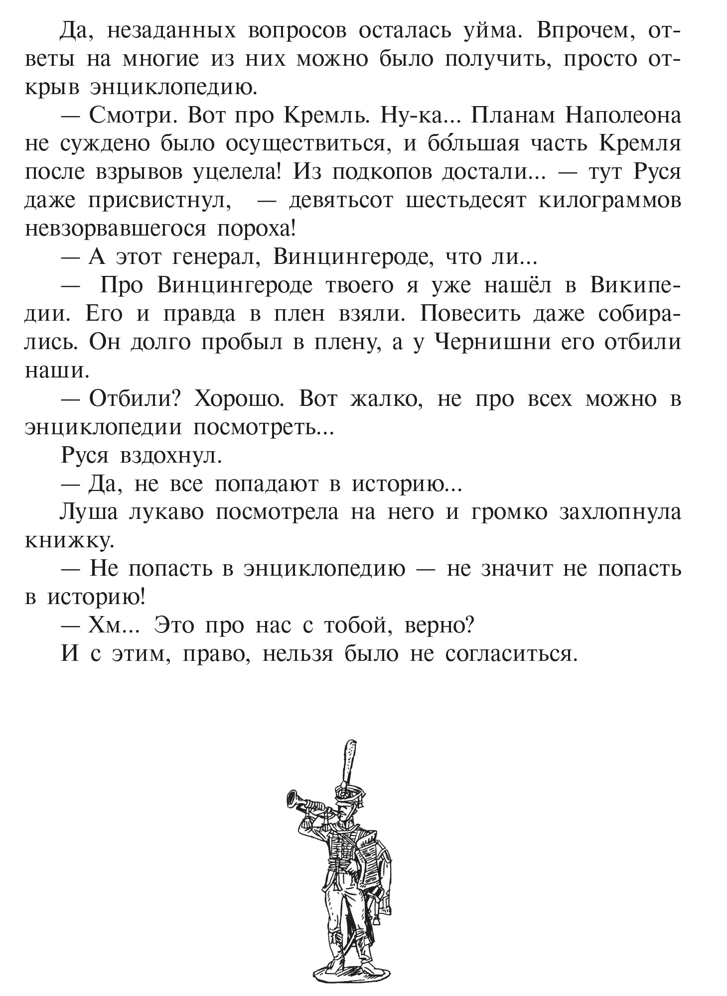 (12+) Близнецы Руся и Луша Раевские даже представить не могли, что умеют нырять в прошлое. Более того! Именно от них теперь зависит победа русского войска над Наполеоном. Всё это кажется невероятным и немыслимым, но это правда. Брат и сестра оказываются в Москве 1812 года и становятся не просто наблюдателями исторических событий, но и активными участниками! Они знакомятся с самим императором Франции, ожидающим ключи от столицы, с Кутузовым, задумавшим перехитрить врагов, уйти от битвы и измотать неприятеля. Но смогут ли школьники снова оказаться дома или их «нырок» — это билет в один конец? Для среднего и старшего школьного возраста.