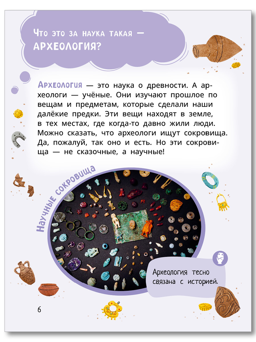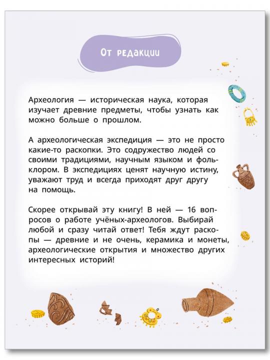 (6+) Чем занимаются археологи? Зачем они копают землю, неужели ищут кости динозавров? Что такое культурный слой и почему он похож на пирог? Как можно попасть на раскопки, если ты не учёный? И что интересного может поведать нам глиняный горшок?