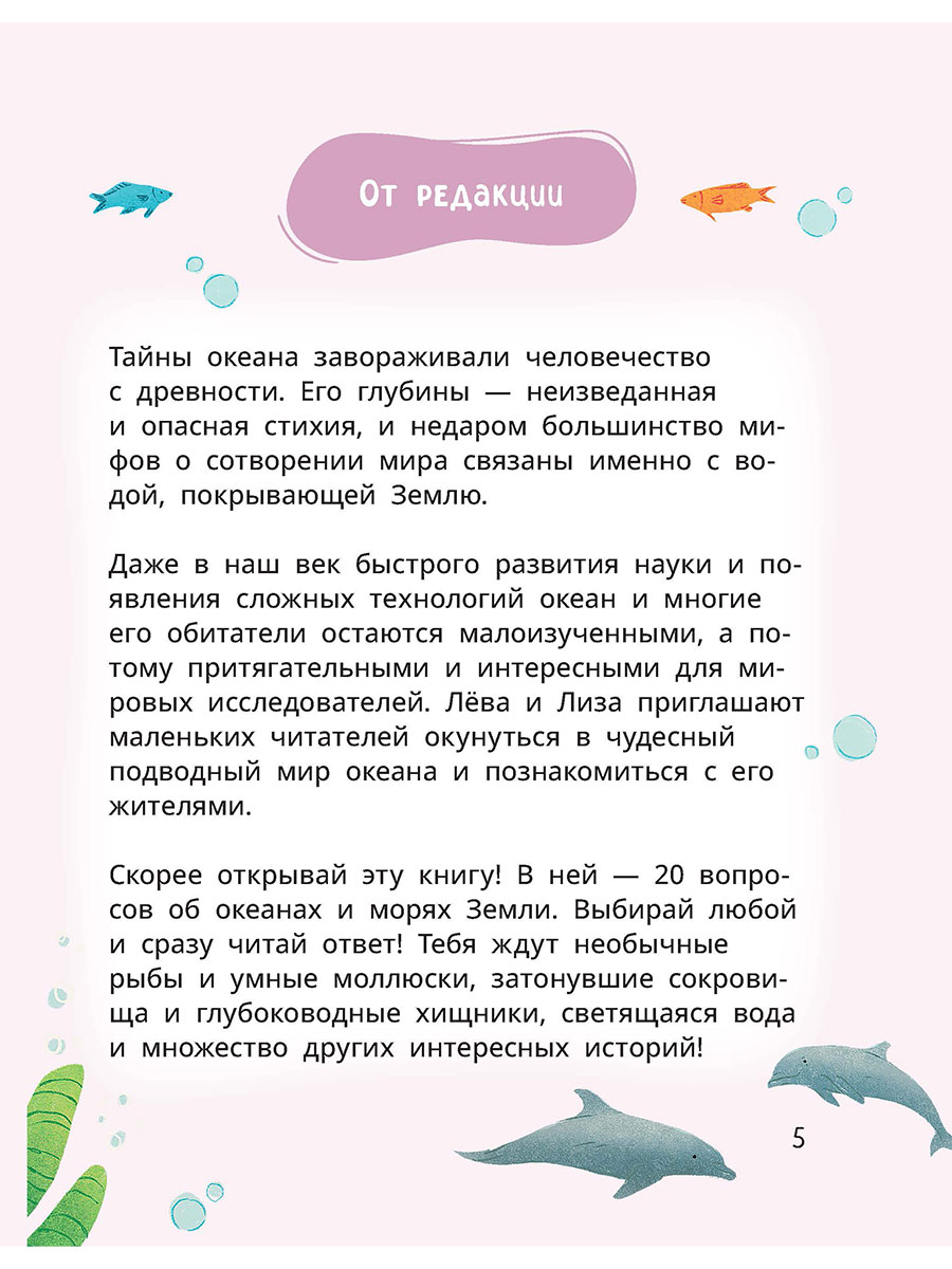 (6+) Правда ли, что некоторые рыбы умеют светить фонариками? У какого морского животного целых девять мозгов? Как океаны влияют на нашу планету и почему их так сложно изучать? Не думай, что на интересные детские вопросы бывают только сложные и скучные взрослые ответы. Если любишь узнавать новое и увлекательное об окружающем мире — скорее открывай эту книгу! Ты задаёшь вопросы — Лёва и Лиза на них отвечают!