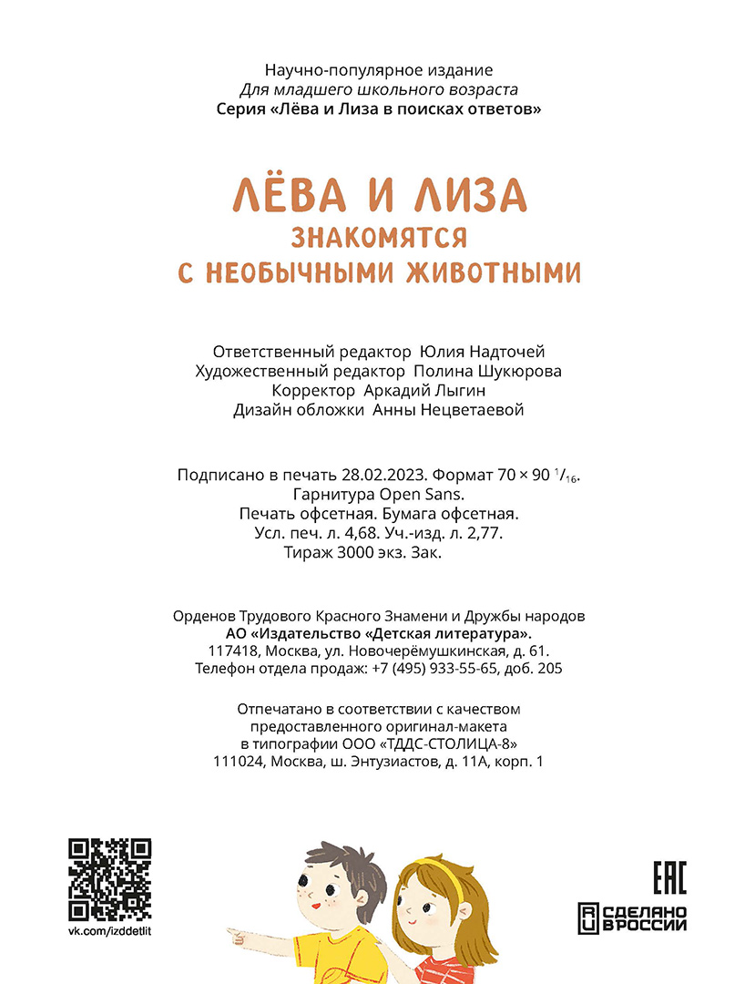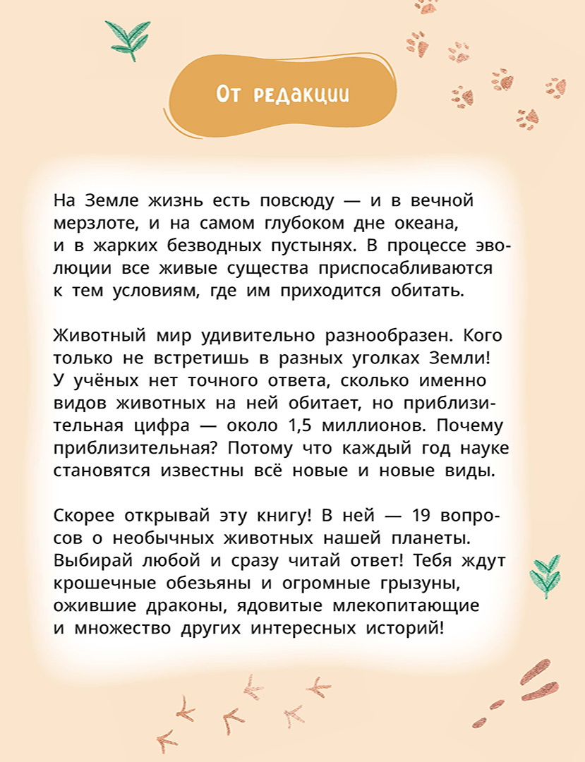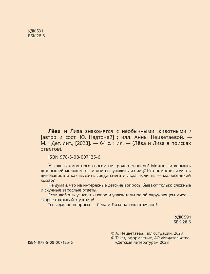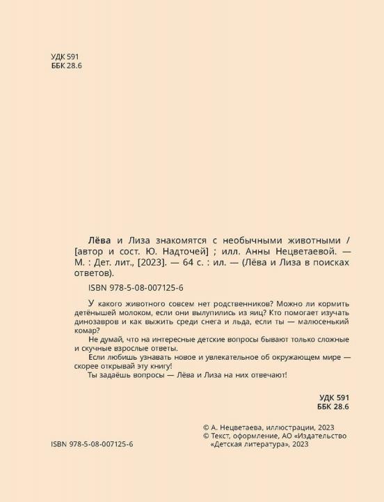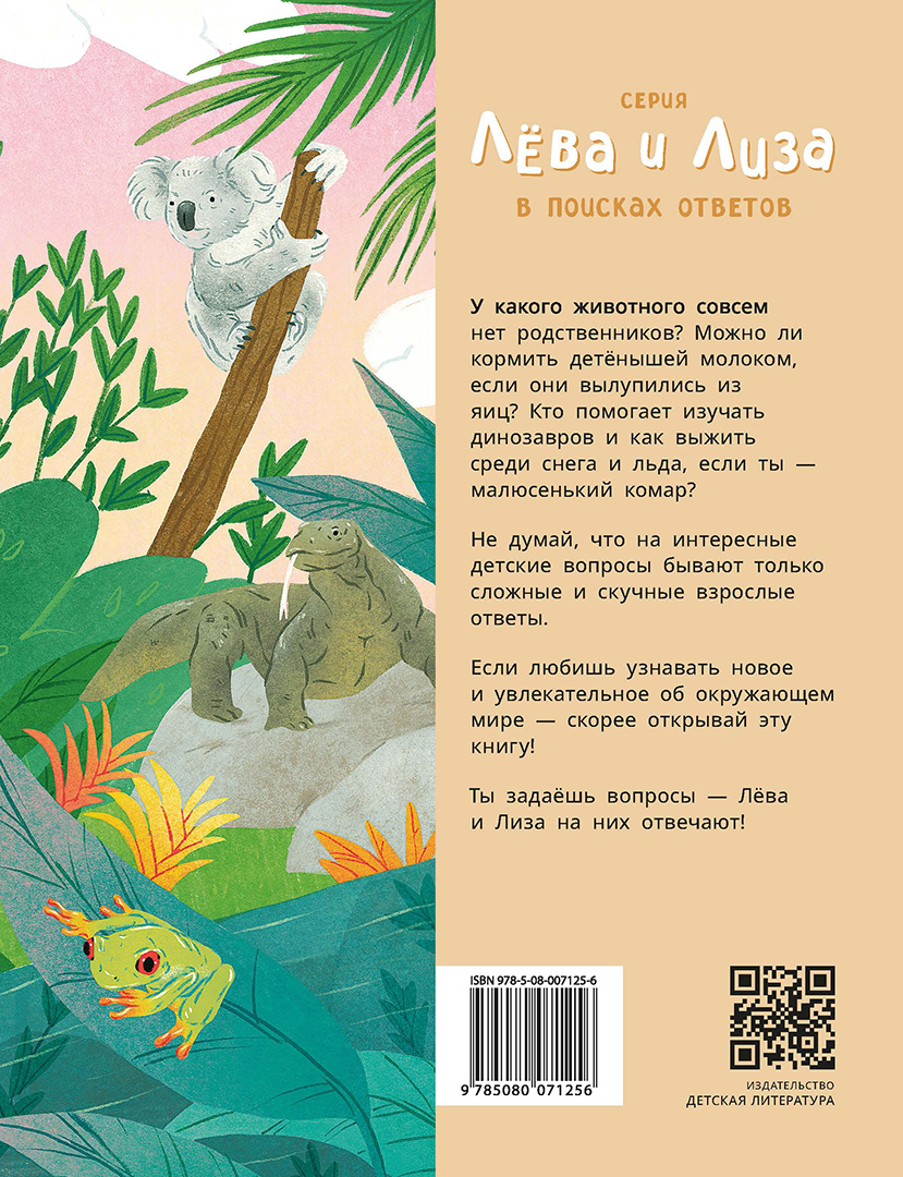 (6+) У какого животного совсем нет родственников? Можно ли кормить детёнышей молоком, если они вылупились из яиц? Кто помогает изучать динозавров и как выжить среди снега и льда, если ты — малюсенький комар? Не думай, что на интересные детские вопросы бывают только сложные и скучные взрослые ответы. Если любишь узнавать новое и увлекательное об окружающем мире — скорее открывай эту книгу! Ты задаёшь вопросы — Лёва и Лиза на них отвечают!