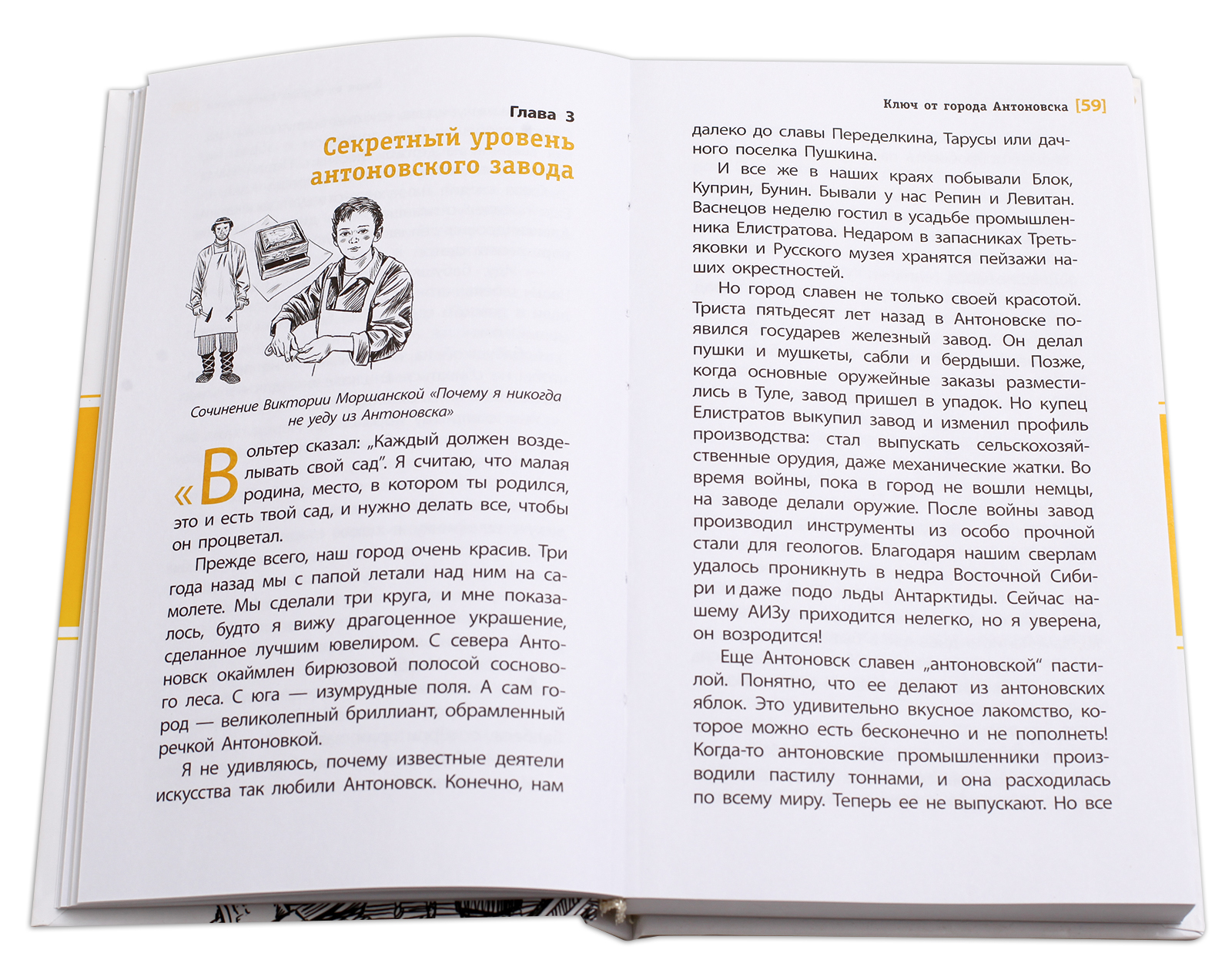 (12+) В повести «Ключ от города Антоновска» рассказывается, как много можно изменить, если бороться до конца. Над городом нависла экологическая угроза, которой взрослые не в силах противостоять. И тогда на защиту родного Антоновска встают дети. У каждого из ребят кроме защиты городка есть и свои личные, не менее важные проблемы. Но со всеми этими трудностями помогут справиться дружба, взаимовыручка и старые добрые книги. Повесть получила третью премию четвертого Конкурса Сергея Михалкова в 2014 г. Для среднего школьного возраста.