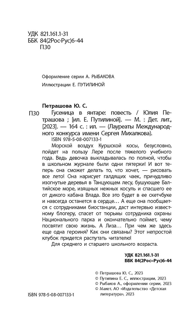 (12+) Морской воздух Куршской косы, безусловно, пойдет на пользу Лере после тяжелого учебного года. Ведь девочка выкладывалась по полной, чтобы в школьном журнале были одни пятерки! И вот теперь она сможет делать то, что хочет, — рисовать все лето! Она нарисует галдящих чаек, причудливо изогнутые деревья в Танцующем лесу, бушующее Балтийское море, изящных нежных косуль и спасшего ее от дикого кабана Влада. Все это будет в ее скетчбуке и навсегда останется в сердце… А еще она пообщается с сотрудниками биостанции, даст интервью известному блогеру, спасет от тюрьмы сотрудника охраны Национального парка и окончательно поймет, чему посвятит свою жизнь. А Лиза… При чем же здесь еще одна героиня? Как они связаны? Этот непростой клубок придется распутать читателю! Для среднего и старшего школьного возраста.