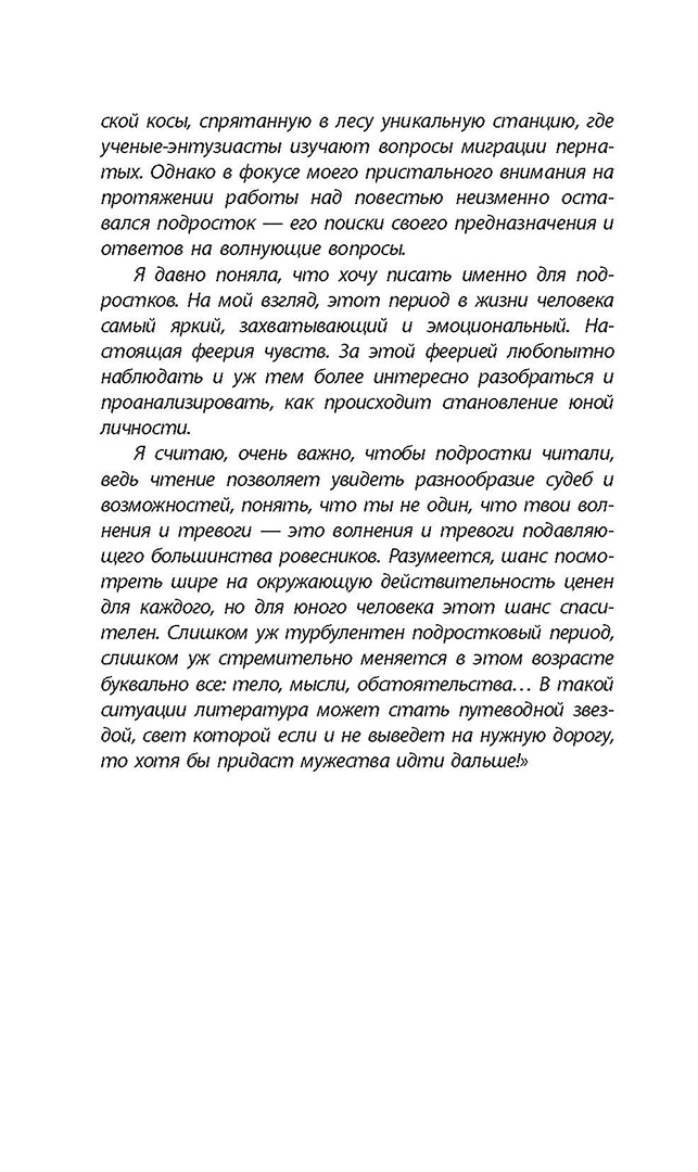 (12+) Морской воздух Куршской косы, безусловно, пойдет на пользу Лере после тяжелого учебного года. Ведь девочка выкладывалась по полной, чтобы в школьном журнале были одни пятерки! И вот теперь она сможет делать то, что хочет, — рисовать все лето! Она нарисует галдящих чаек, причудливо изогнутые деревья в Танцующем лесу, бушующее Балтийское море, изящных нежных косуль и спасшего ее от дикого кабана Влада. Все это будет в ее скетчбуке и навсегда останется в сердце… А еще она пообщается с сотрудниками биостанции, даст интервью известному блогеру, спасет от тюрьмы сотрудника охраны Национального парка и окончательно поймет, чему посвятит свою жизнь. А Лиза… При чем же здесь еще одна героиня? Как они связаны? Этот непростой клубок придется распутать читателю! Для среднего и старшего школьного возраста.