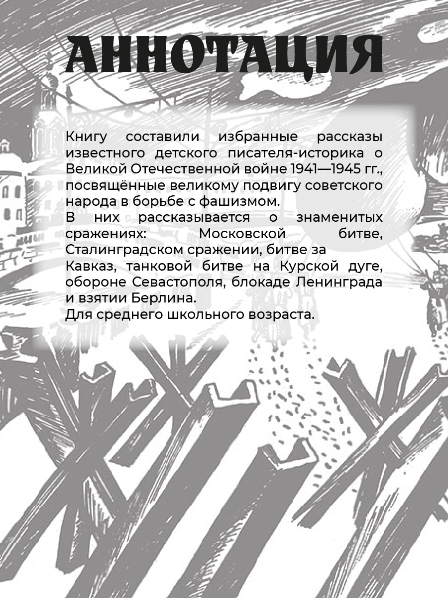 (6+) Книгу составили избранные рассказы известного детского писателя-историка о Великой Отечественной войне 1941—1945 гг., посвящённые великому подвигу советского народа в борьбе с фашизмом. В них рассказывается о знаменитых сражениях: Московской битве, Сталинградском сражении, битве за Кавказ, танковой битве на Курской дуге, обороне Севастополя, блокаде Ленинграда и взятии Берлина. Для среднего школьного возраста.