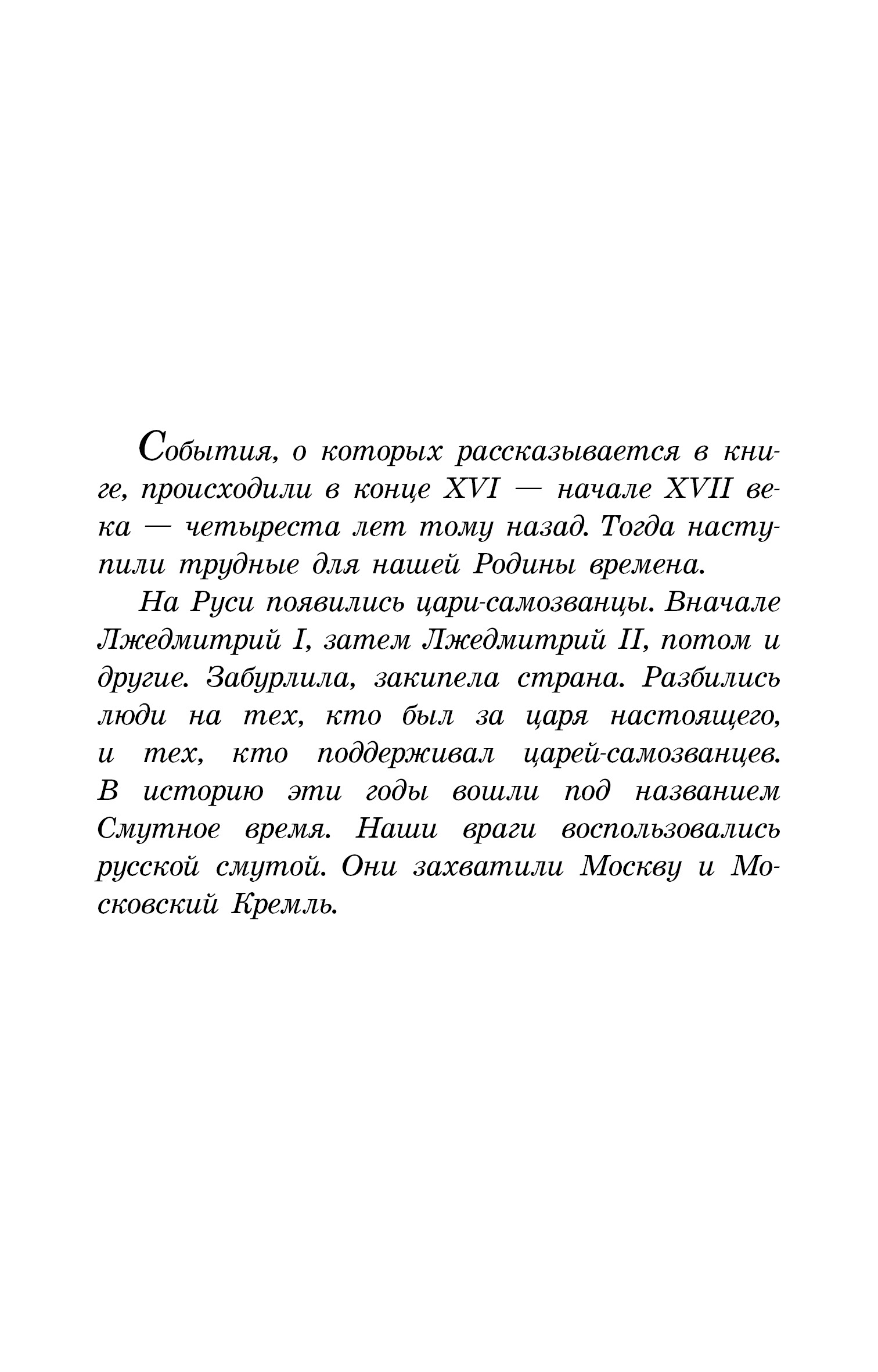 (12+) В книгу вошла повесть в рассказах известного детского писателя, историка Сергея Петровича Алексеева (1922—2008) о событиях конца XVI — начала XVII века, Смутном времени, когда на Руси появились цари-самозванцы, и о победе народного ополчения, изгнавшего поляков из Москвы, во главе с князем Дмитрием Пожарским и Кузьмой Мининым.