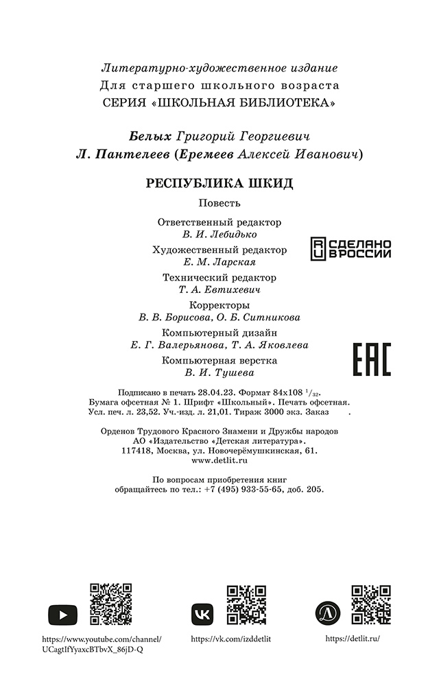 (12+) Замечательная повесть о жизни одного из детских домов 20-х годов XX века — школе индивидуального социального воспитания им. Достоевского, сокращенно ШКИД, — рассказанная ее бывшими воспитанниками. Повесть включена в перечень «100 книг по истории, культуре и литературе народов Российской Федерации, рекомендуемых школьникам к самостоятельному прочтению».