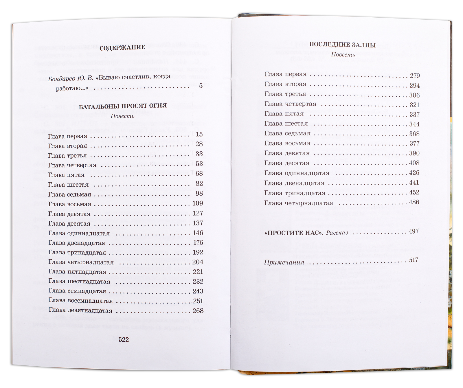 (12+) В книгу вошли широко известные повести о Великой Отечественной войне: «Батальоны просят огня» — о героизме и мужестве бойцов и командиров, первыми переправившихся на правый берег Днепра и ведущих там с фашистами трудный, неравный бой, и «Последние залпы» — о боях накануне победы, в Карпатах, на границе с Чехословакией, где артиллерийская батарея получает приказ задержать немецкие танки, прорывающиеся из советского окружения. Также в книге помещен рассказ «Простите нас», ставящий перед читателем важные нравственные вопросы. Роман включен в перечень "100 книг по истории, культуре и литературе народов Российской Федерации, рекомендуемые школьникам к самостоятельному прочтению". Для старшего школьного возраста.