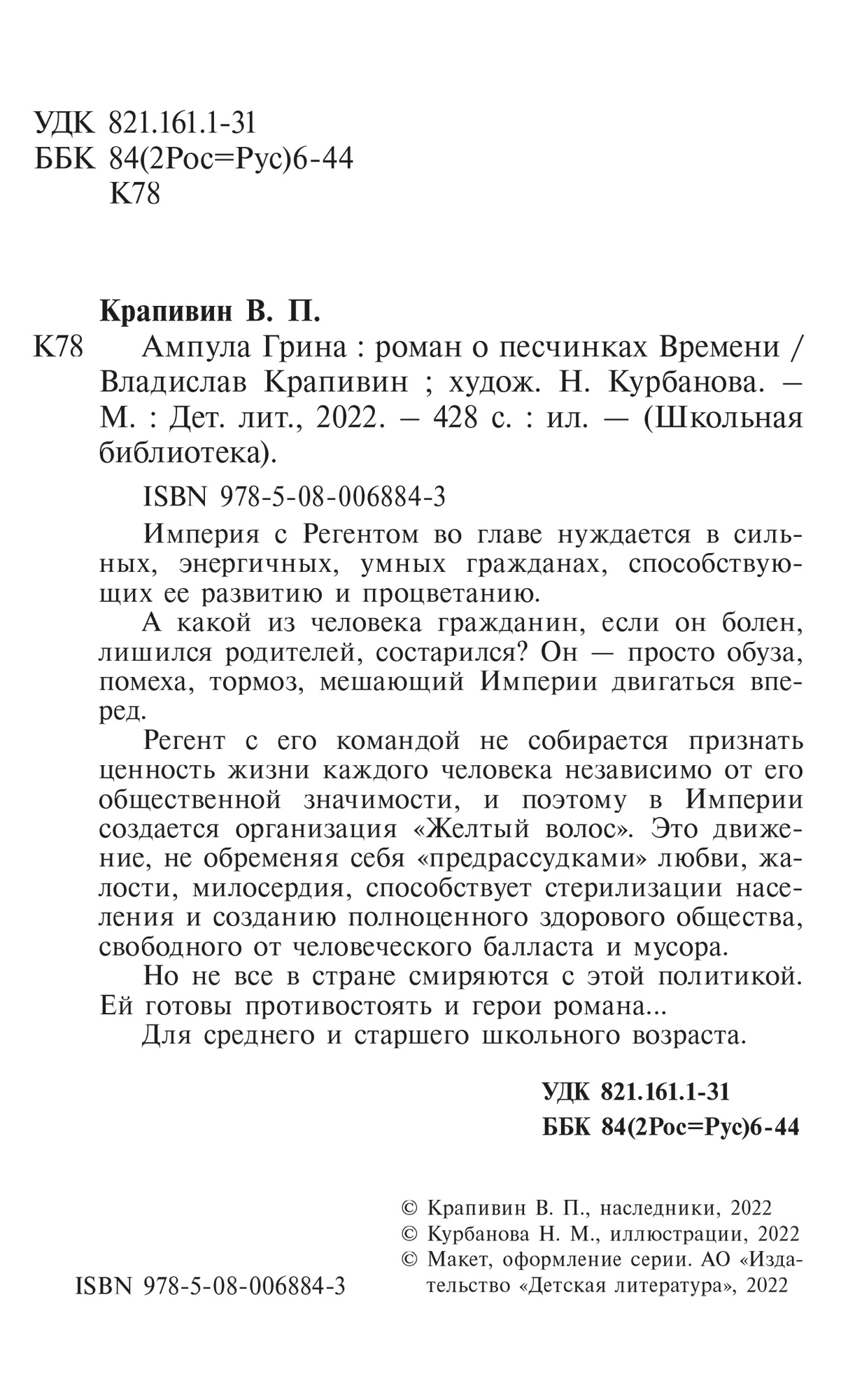 (12+) Империя с Регентом во главе нуждается в сильных, энергичных, умных гражданах, способствующих ее развитию и процветанию. А какой из человека гражданин, если он болен, лишился родителей, состарился? Он — просто обуза, помеха, тормоз, мешающий Империи двигаться вперед. Регент с его командой не собирается признать ценность жизни каждого человека независимо от его общественной значимости, и поэтому в Империи создается организация "Желтый волос". Это движение, не обременяя себя "предрассудками" любви, жалости, милосердия, способствует стерилизации населения и созданию полноценного здорового общества, свободного от человеческого балласта и мусора. Но не все в стране смиряются с этой политикой. Ей готовы противостоять и герои романа… Для среднего и старшего школьного возраста.