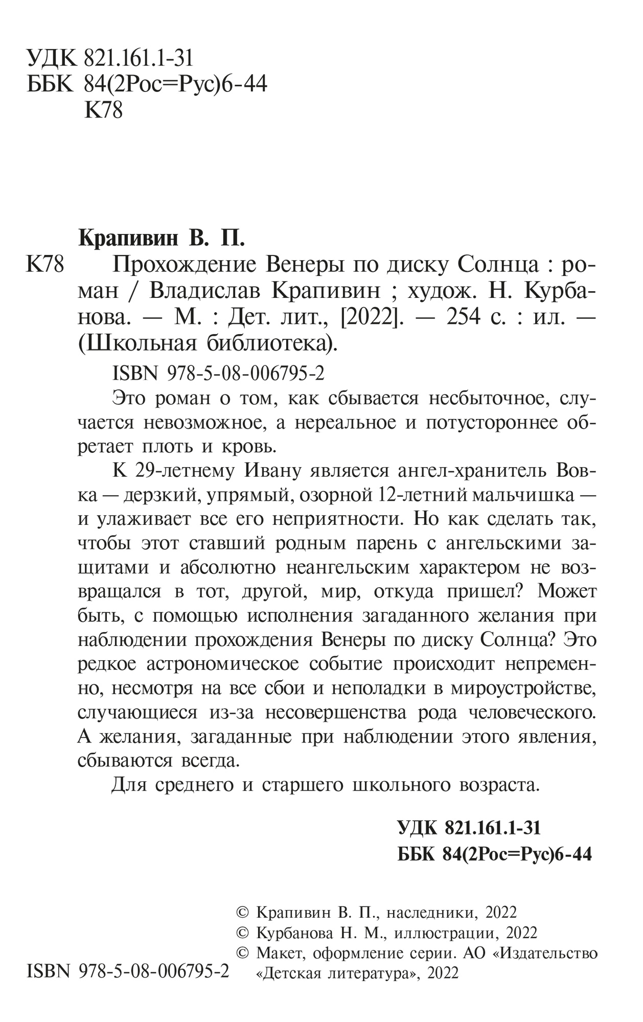 (12+) Это роман о том, как сбывается несбыточное, случается невозможное, а нереальное и потустороннее обретает плоть и кровь. К 29-летнему Ивану является ангел-хранитель Вовка — дерзкий, упрямый, озорной 12-летний мальчишка — и улаживает все его неприятности. Но как сделать так, чтобы этот ставший родным парень с ангельскими защитами и абсолютно неангельским характером не возвращался в тот, другой, мир, откуда пришел? Может быть, с помощью исполнения загаданного желания при наблюдении прохождения Венеры по диску Солнца? Это редкое астрономическое событие происходит непременно, несмотря на все сбои и неполадки в мироустройстве, случающиеся из-за несовершенства рода человеческого. А желания, загаданные при наблюдении этого явления, сбываются всегда. Для среднего и старшего школьного возраста.