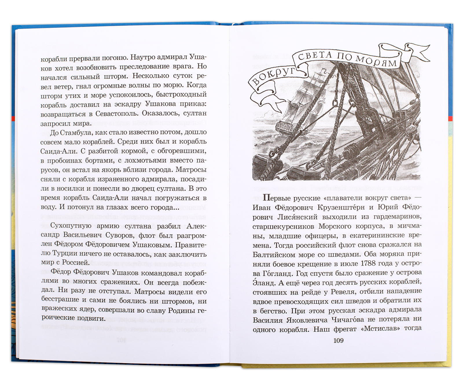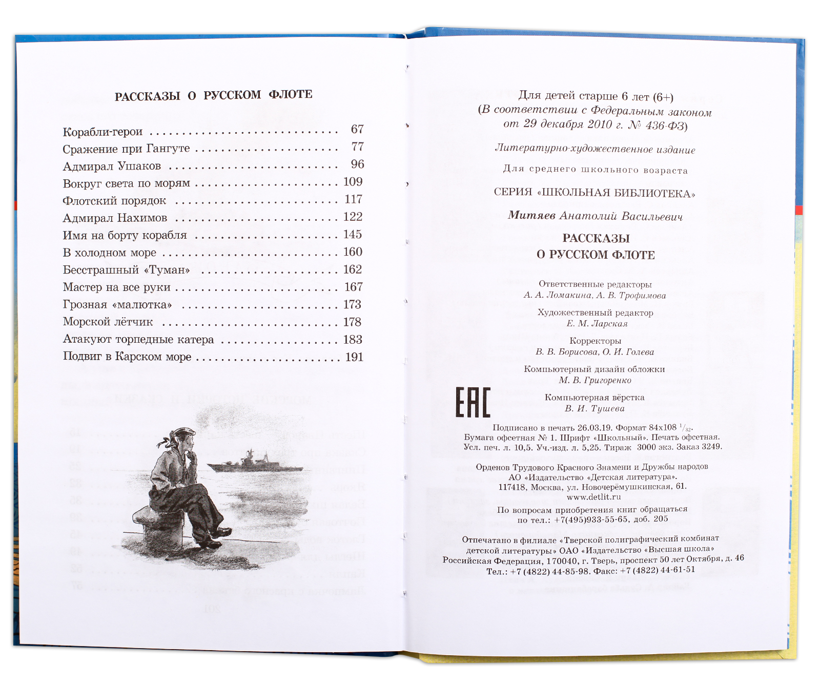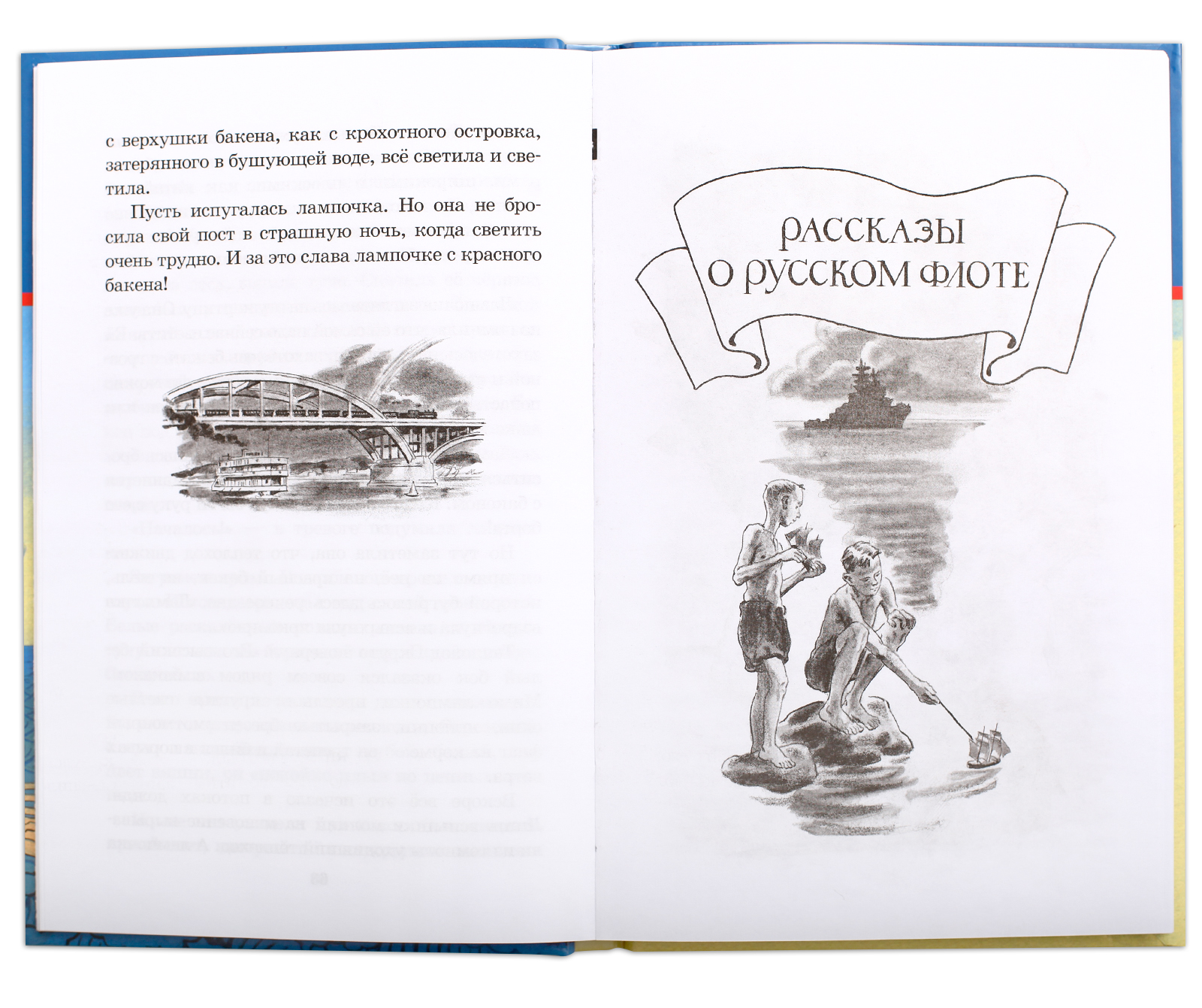 (6+) В книгу вошли рассказы о знаменитых адмиралах, о морских баталиях времён Петра I и Русско-турецких войн, о плаваниях по морям и океанам вокруг света, цикл рассказов "В холодном море", а также сказки для детей.