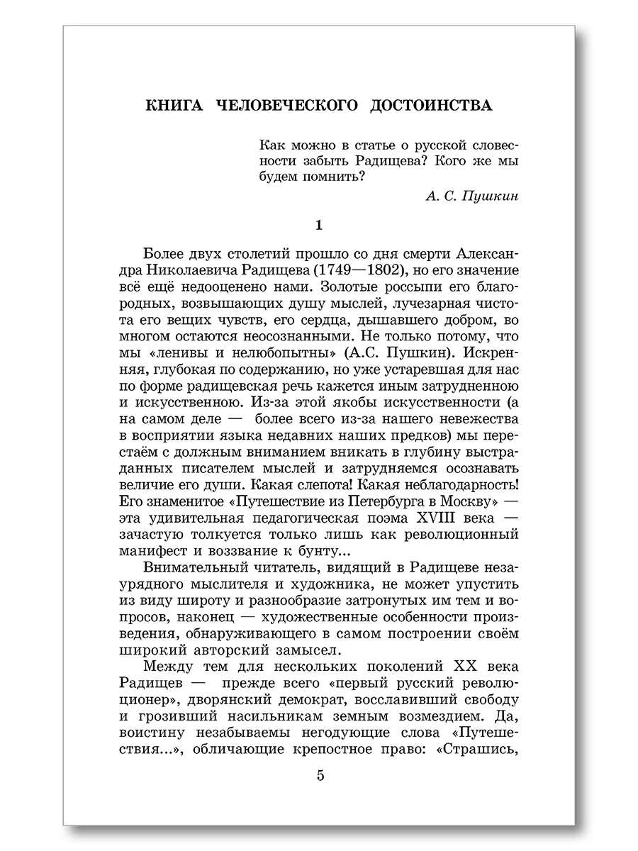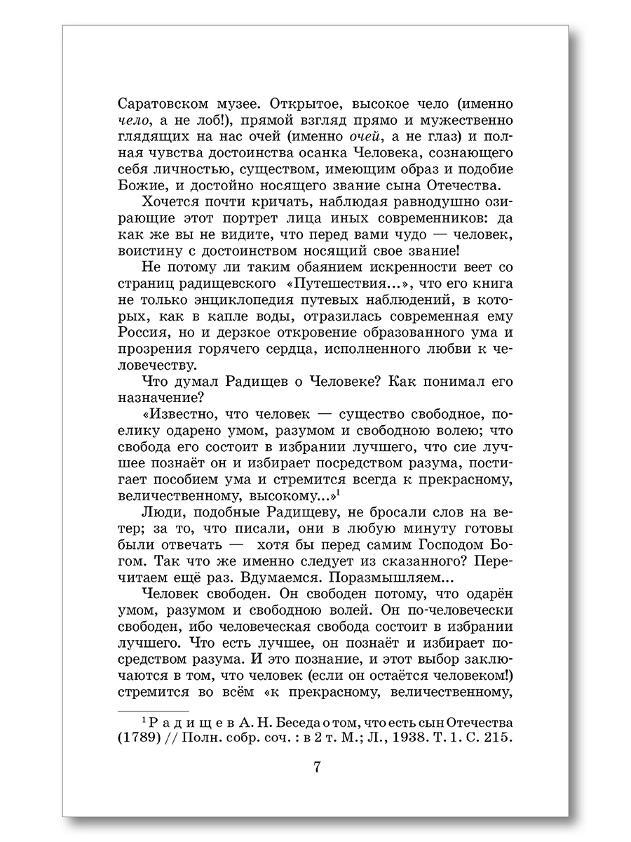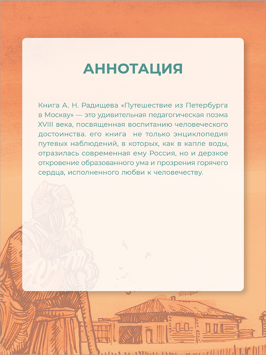 (12+) Книга А. Н. Радищева «Путешествие из Петербурга в Москву» — это удивительная педагогическая поэма XVIII века, посвященная воспитанию человеческого достоинства. Его книга не только энциклопедия путевых наблюдений, в которых, как в капле воды, отразилась современная ему Россия, но и дерзкое откровение образованного ума и прозрения горячего сердца, исполненного любви к человечеству.