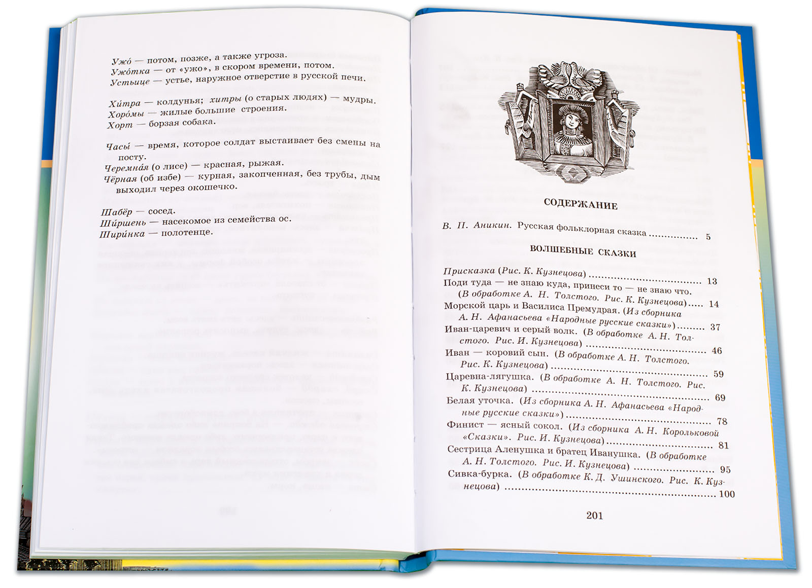 (6+) В книгу входят любимые детьми многих поколений русские народные сказки: волшебные ("Иван-царевич и серый волк", "Царевна-лягушка", "Гуси-лебеди" и др.), о животных ("Лиса и волк", "Теремок", "Репка" и др.), бытовые ("Лутонюшка", "Кашица из топора", "Жена-спорщица" и др.). Для среднего школьного возраста.