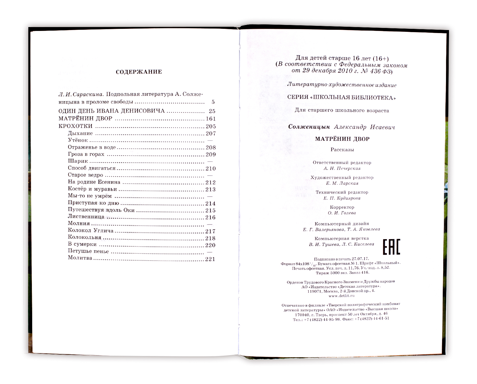 (12+) В книгу замечательного русского писателя А.И.Солженицына входят рассказы "Один день Ивана Денисовича", "Матренин двор" и цикл миниатюр "Крохотки". Для старшего школьного возраста.