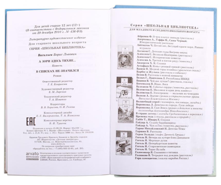 (12+) В книгу вошли произведения о Великой Отечественной войне-повесть "А зори здесь тихие..." и роман "В списках не значился". Для старшего школьного возраста.