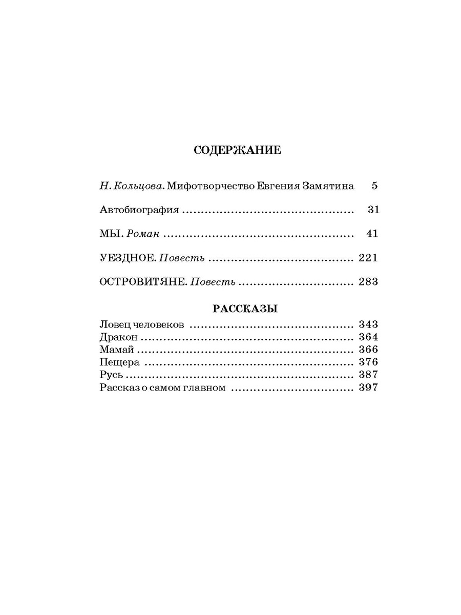 (12+) В книгу замечательного русского писателя Евгения Замятина вошли всемирно известный роман "Мы", повесть "Уездное", "английские" произведения "Островитяне" и "Ловец человеков", а также избранные рассказы ("Дракон", "Мамай", "Пещера", "Русь", "Рассказ о самом главном").