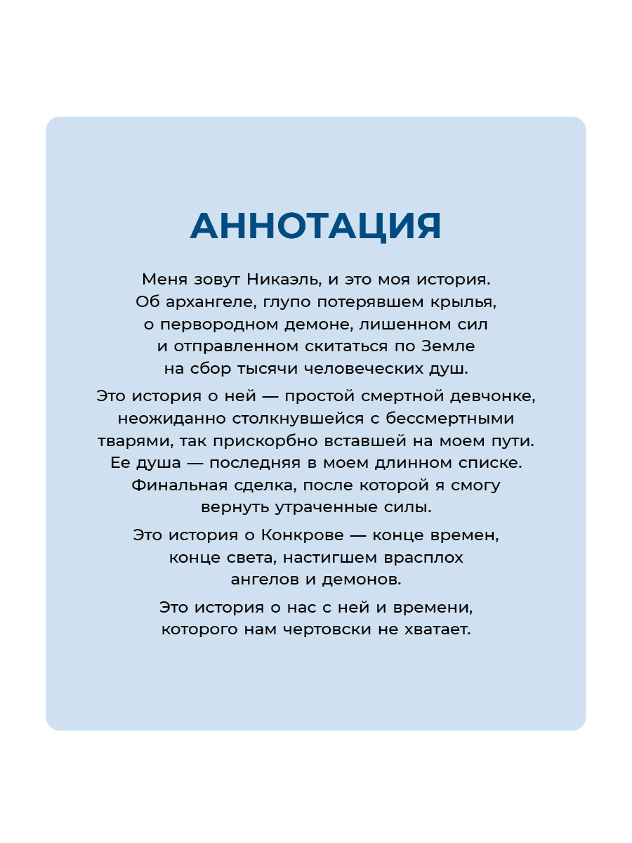 (18+) Меня зовут Никаэль, и это моя история. Об архангеле, глупо потерявшем крылья, о первородном демоне, лишенном сил и отправленном скитаться по Земле на сбор тысячи человеческих душ.