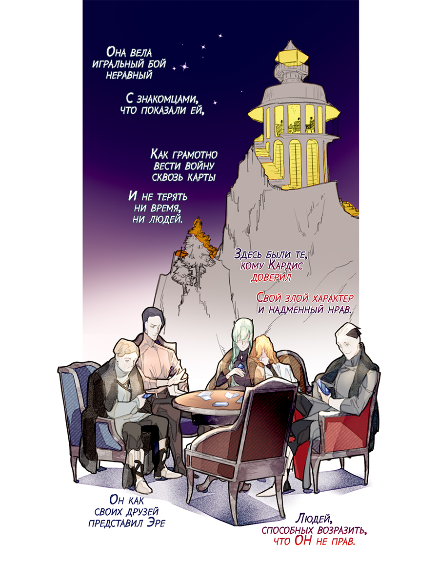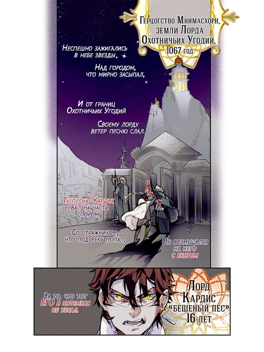 (12+) Стихотворный сказ о гордом Лорде Кардисе “Бешеном Псе” и о страдающем от него окружении. В тихом уголке Лукоморья, в Мнимасхорне, занятная компания, скрывшись от глаз своего несколько неуравновешенного Лорда, развернула карточную игру. Среди игроков оказалась и прекрасная иностранка Эра, что попала в угодья Лорда не по своей воле. За игрой разговоры зашли в обсуждение Лорда. И как выяснилось, многие из присутствующих оказались здесь также не по собственному желанию. Настало время узнать историю одного из бедолаг – Хриза. С чего все началось, и почему он до сих пор не сбежал?