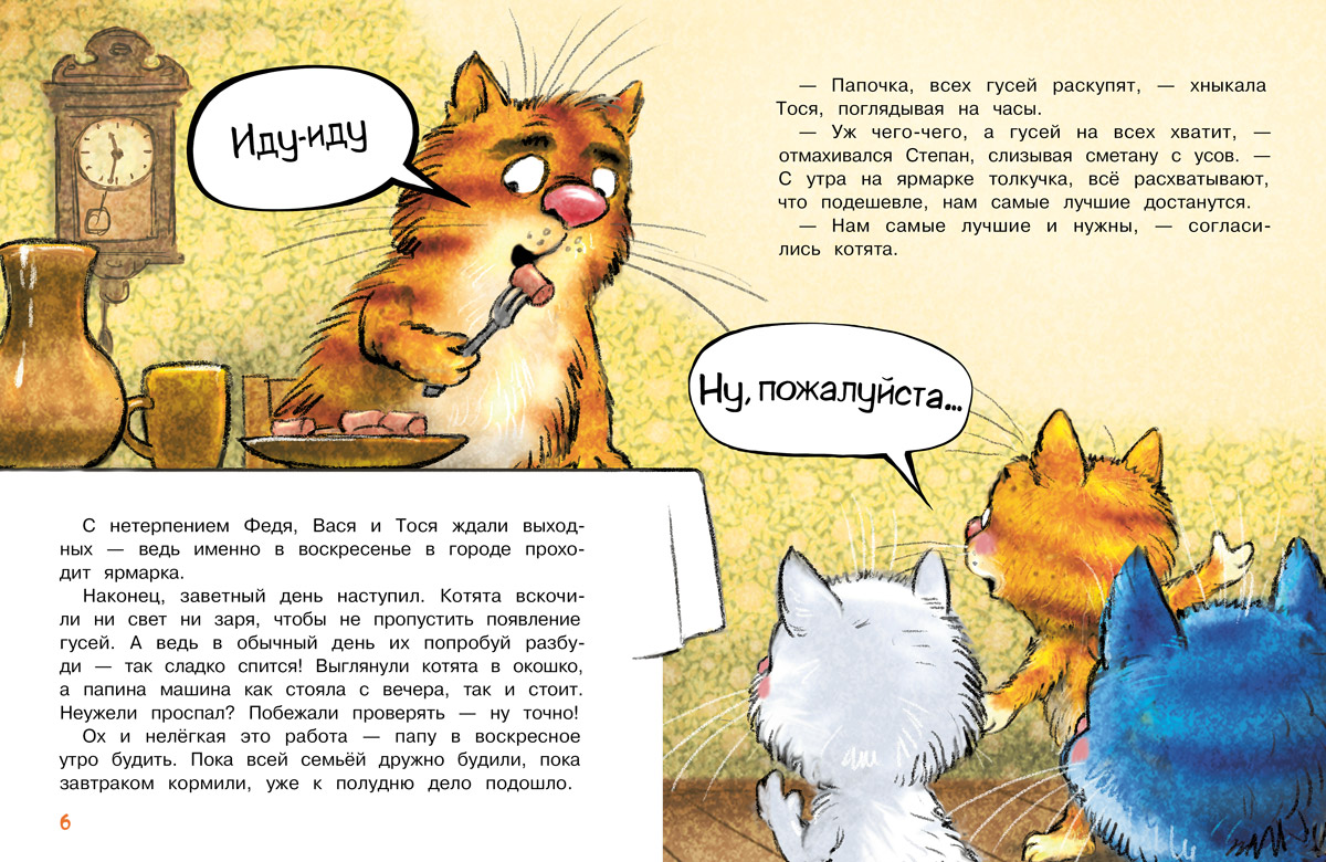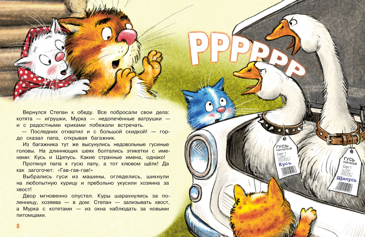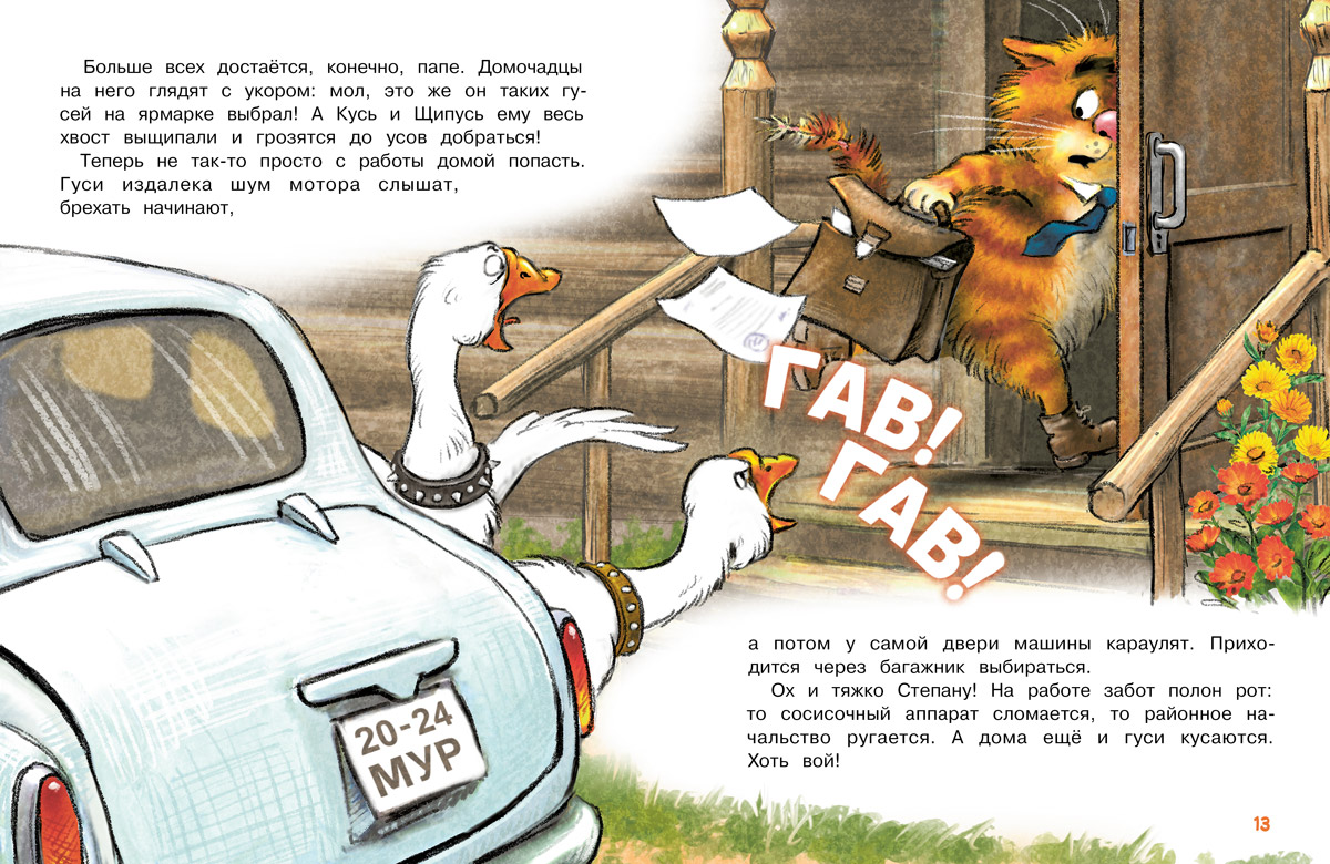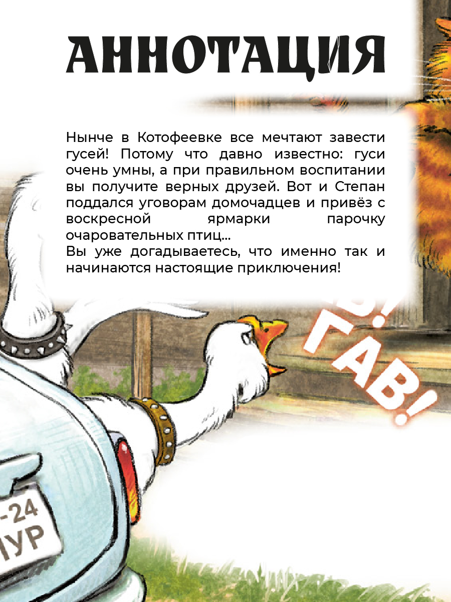 (3+) Нынче в Котофеевке все мечтают завести гусей! Потому что давно известно: гуси очень умны, а при правильном воспитании вы получите верных друзей. Вот и Степан поддался уговорам домочадцев и привёз с воскресной ярмарки парочку очаровательных птиц… Вы уже догадываетесь, что именно так и начинаются настоящие приключения!