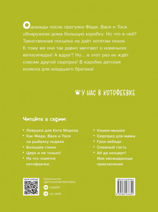 (3+) Однажды после прогулки Федя, Вася и Тося обнаружили дома большую коробку. Но что в ней? Таинственная посылка не даёт котятам покоя. К тому же они так давно мечтают о новеньких велосипедах! А вдруг? Но… в этот раз их ждёт совсем другой сюрприз. В коробке детская коляска для младшего братика!
