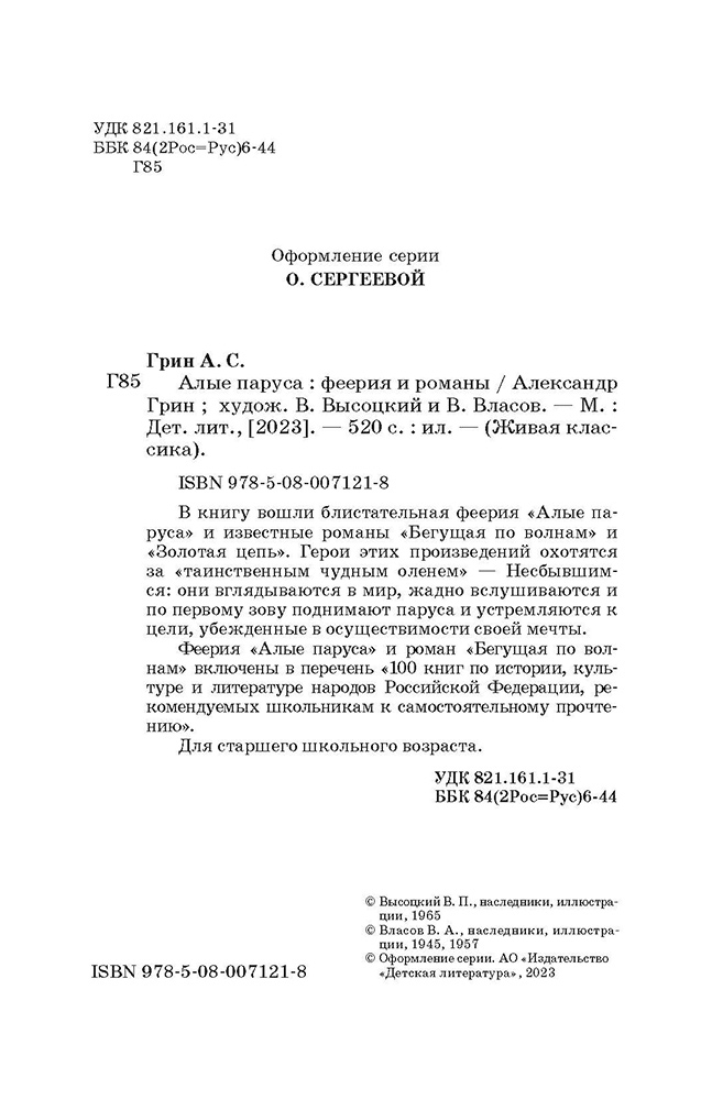 (12+) В книгу вошли блистательная феерия «Алые паруса» и известные романы «Бегущая по волнам» и «Золотая цепь». Герои этих произведений охотятся за «таинственным чудным оленем» — Несбывшимся: они вглядываются в мир, жадно вслушиваются и по первому зову поднимают паруса и устремляются к цели, убежденные в осуществимости своей мечты. Для старшего школьного возраста.