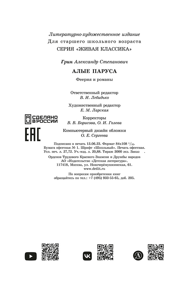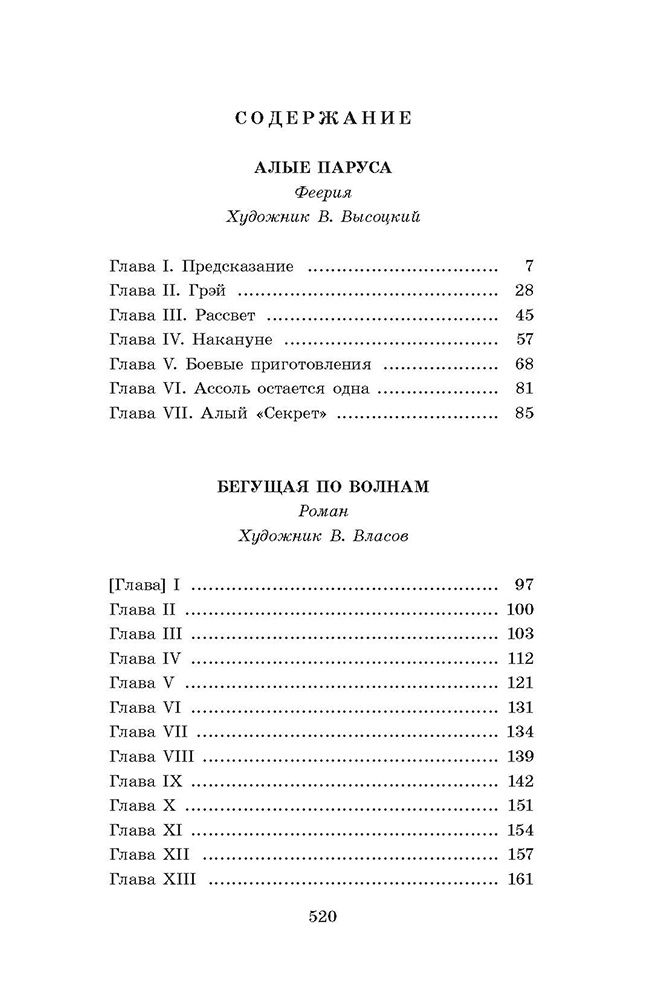 (12+) В книгу вошли блистательная феерия «Алые паруса» и известные романы «Бегущая по волнам» и «Золотая цепь». Герои этих произведений охотятся за «таинственным чудным оленем» — Несбывшимся: они вглядываются в мир, жадно вслушиваются и по первому зову поднимают паруса и устремляются к цели, убежденные в осуществимости своей мечты. Для старшего школьного возраста.