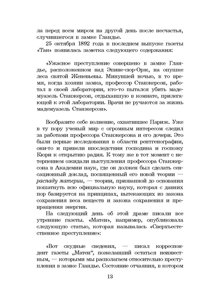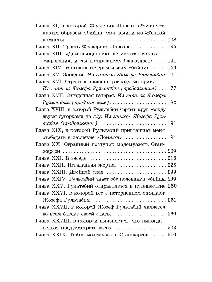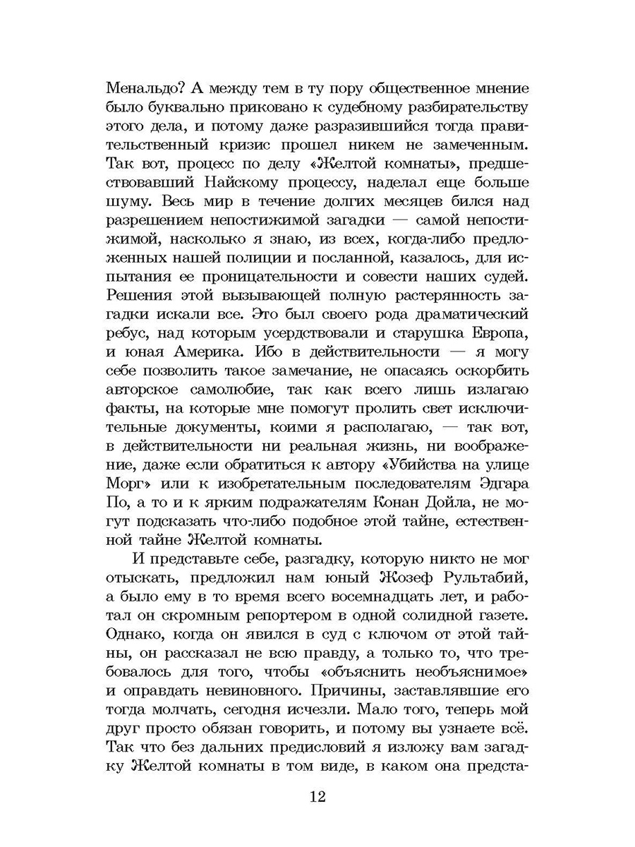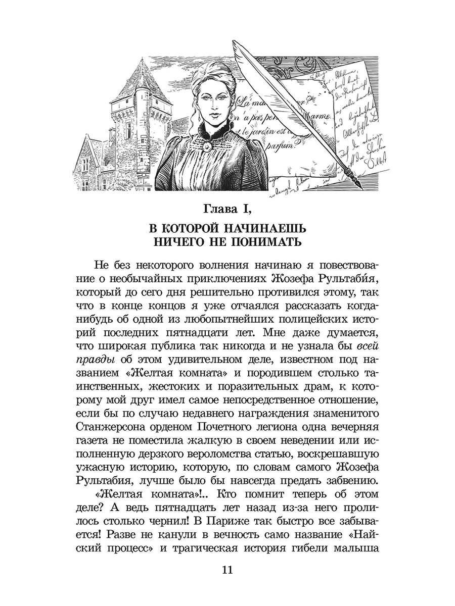 (12+) Нападение на мадемуазель Матильду Станжерсон потрясло всю Францию. Дочь известного профессора, работающего над доказательством распада материи, ранена в голову в собственной комнате, расположенной во флигеле старинного замка Гландье. Загадка состоит в том, как преступник исчез из комнаты, ведь дверь была закрыта мадемуазель изнутри, как и ставни единственного окна. Подпола, люка на чердак или любого другого выхода полиция не обнаружила... Найти ключ к этой тайне берется молодой репортер Жозеф Рультабий, склад ума которого вызывает восхищение коллег. «Тайна Жёлтой комнаты» стала классикой детективного жанра. Для старшего школьного возраста.